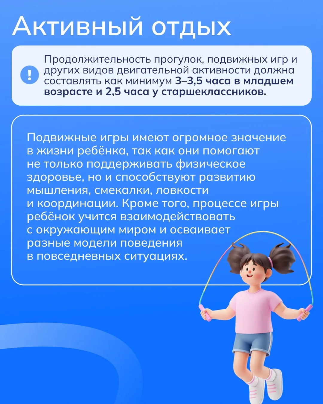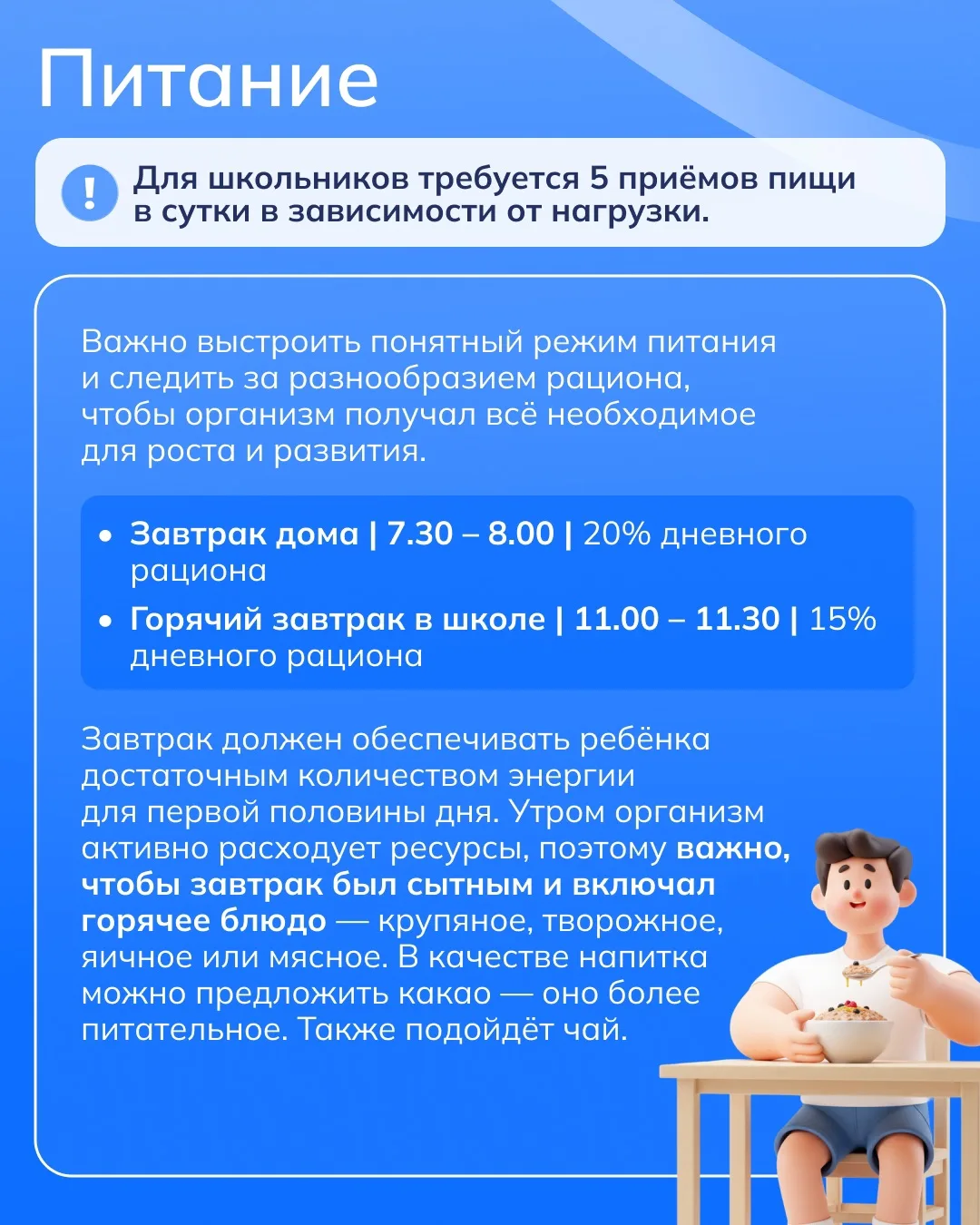 В течение дня ребёнок активно проводит время: посещает занятия, общается с друзьями, участвует в подвижных играх, развивает свои интересы. При таком насыщенном ритме важно, чтобы привычки помогали сохранять баланс и поддерживать хорошее самочувствие.