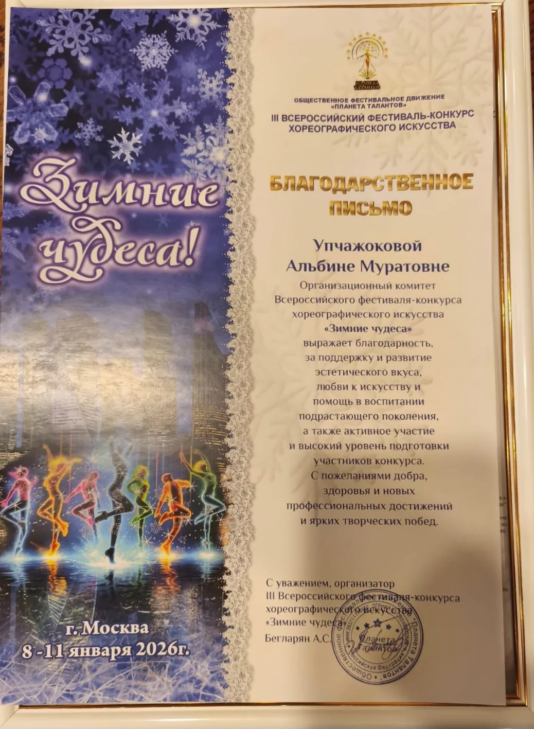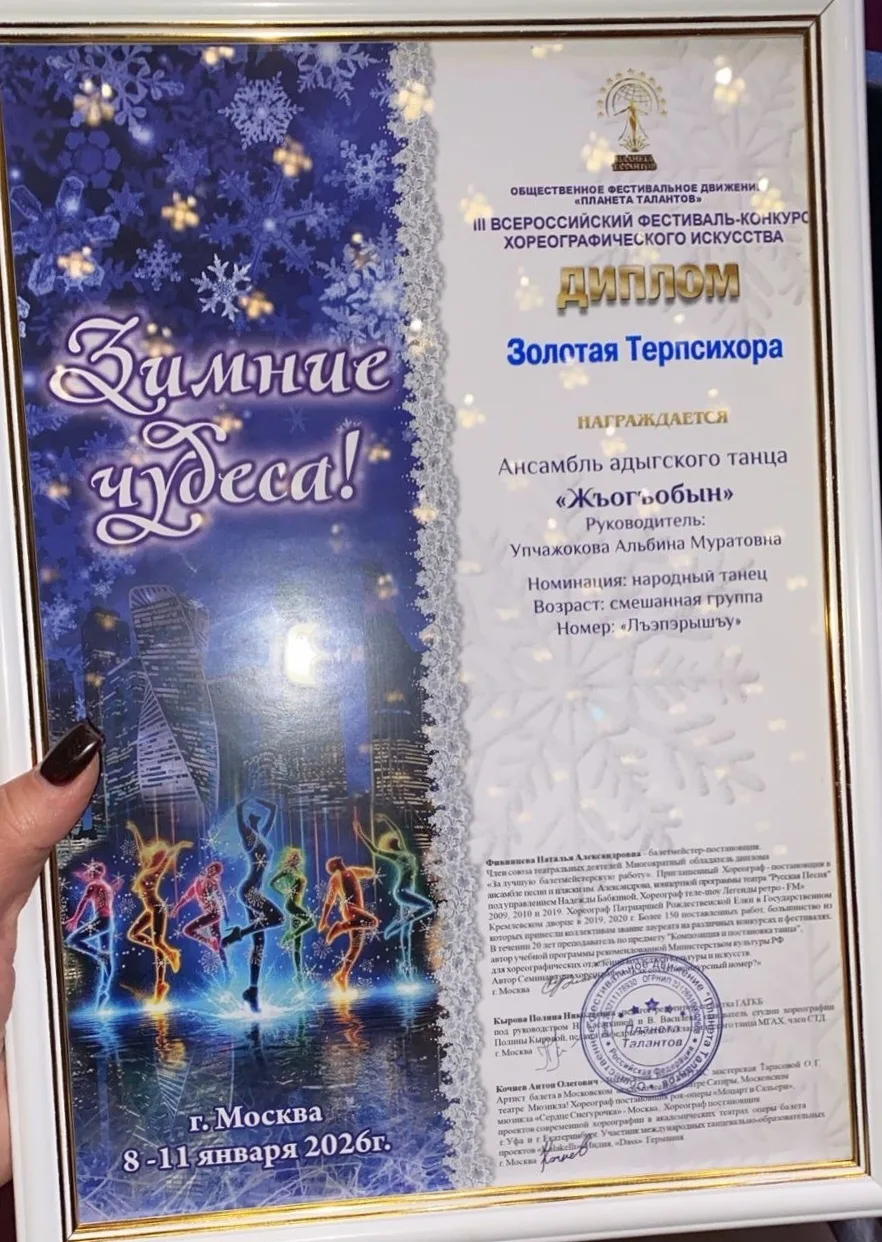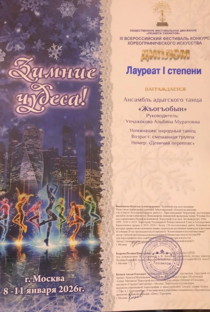 Хореографический ансамбль «Жъогъобын» филиала-СДК аула Хачемзий (рук. Альбина Упчажокова) принял участие во Всероссийском фестивале-конкурсе сценического искусства «Зимние чудеса», который проходил в г. Москва.