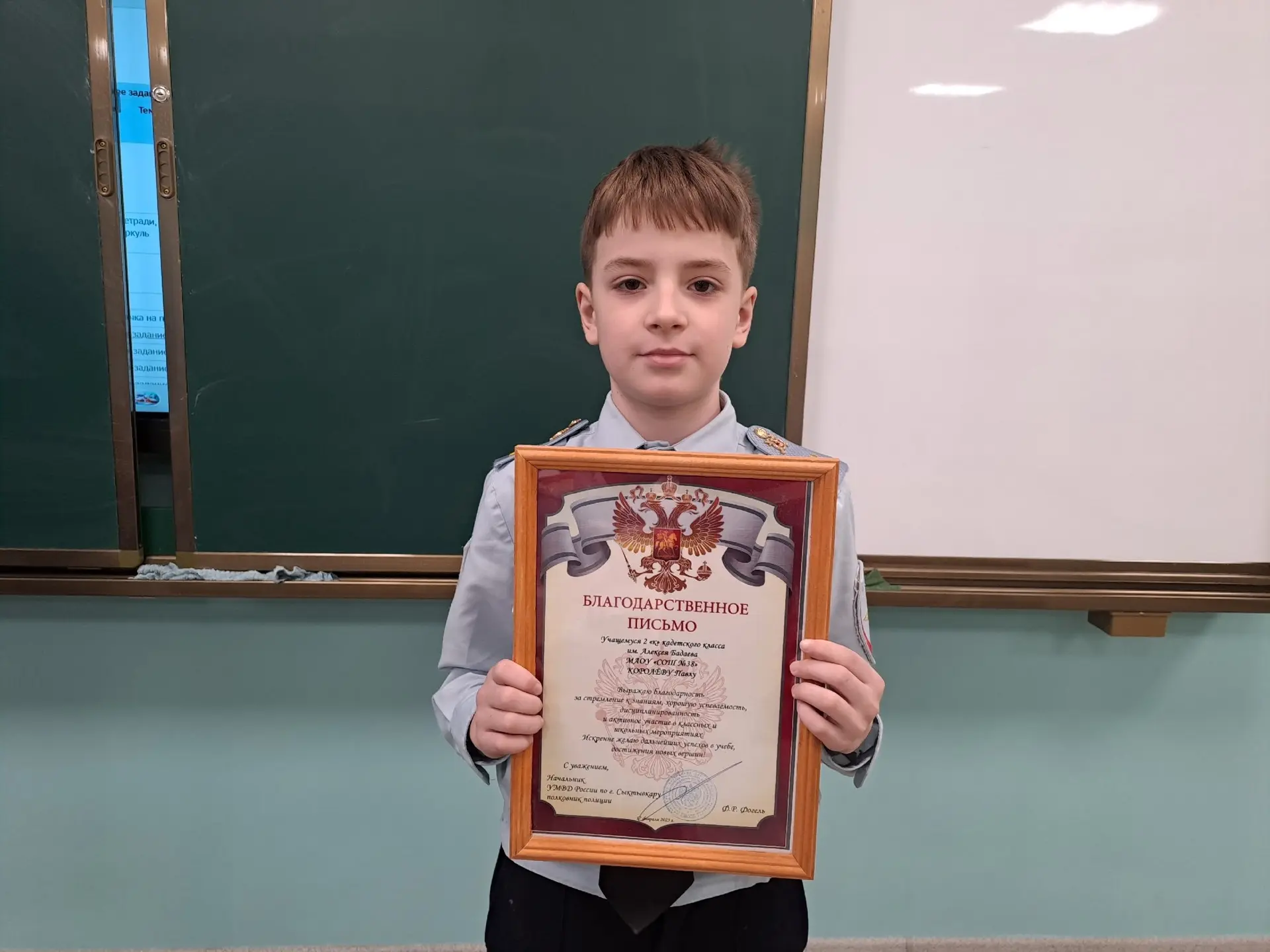 Ученики 3 "К" имени Алексея Бадаева и 7 "К" классов получили благодарственные письма от начальника УМВД России по г. Сыктывкару за стремление к знаниям, хорошую успеваемость, дисциплинированность, и активное участие в классных и школьных мероприятиях.