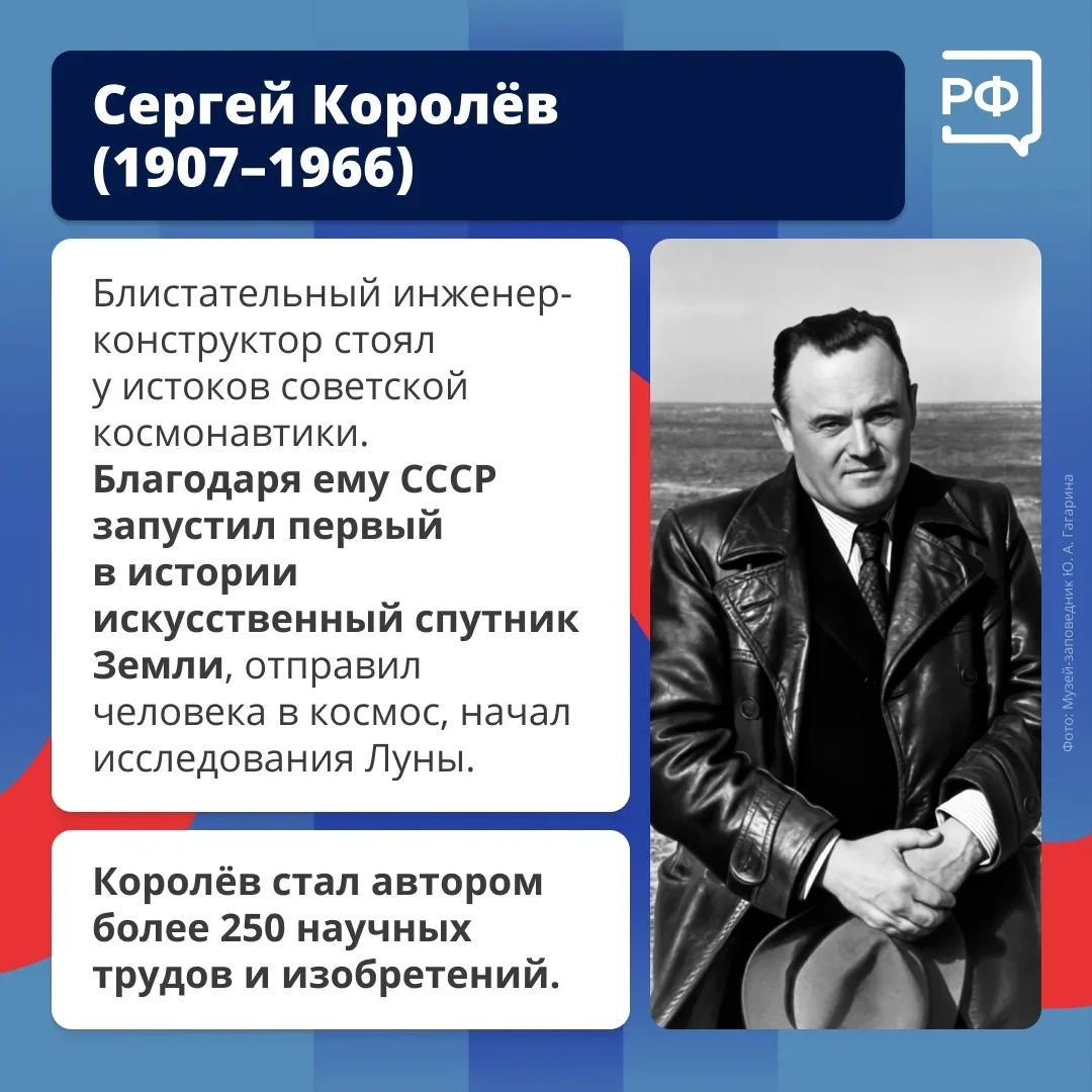 Так говорил легендарный конструктор Сергей Королёв. Он стал творцом нашей главной космической победы — первого полёта человека на орбиту. Вместе с ним работали и другие выдающиеся учёные, инженеры и конструкторы. Рассказываем о них в карточках!