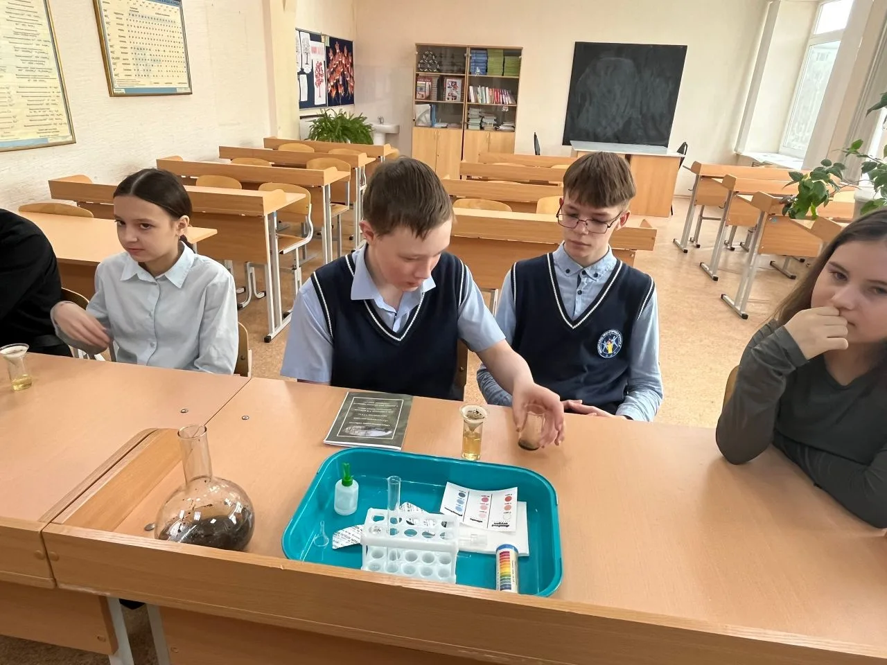 🌡️На станции «Химия сред обитания» (учитель Лысюк О.С.) гости лицея рассмотрели понятие «среда обитания» сквозь призму химии. С помощью реактивов они экспериментально изучили состав почвы: определили pH, нитраты. Участники узнали, как корни растений выделяют кислоты, меняя кислотность почвы, а бактерии разлагают органику, обогащая её питательными веществами. Как кислотный дождь вредит организмам. Практика с индикаторами и простыми тестами показала: химия объясняет баланс в природе.