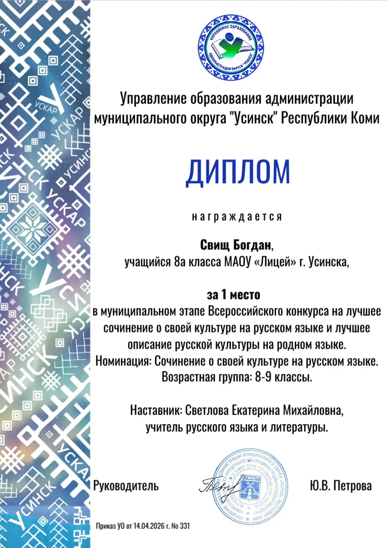 Управление образования администрации округа «Усинск»
