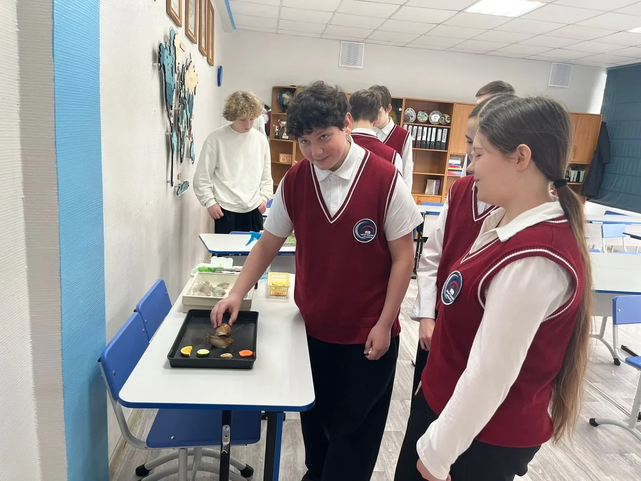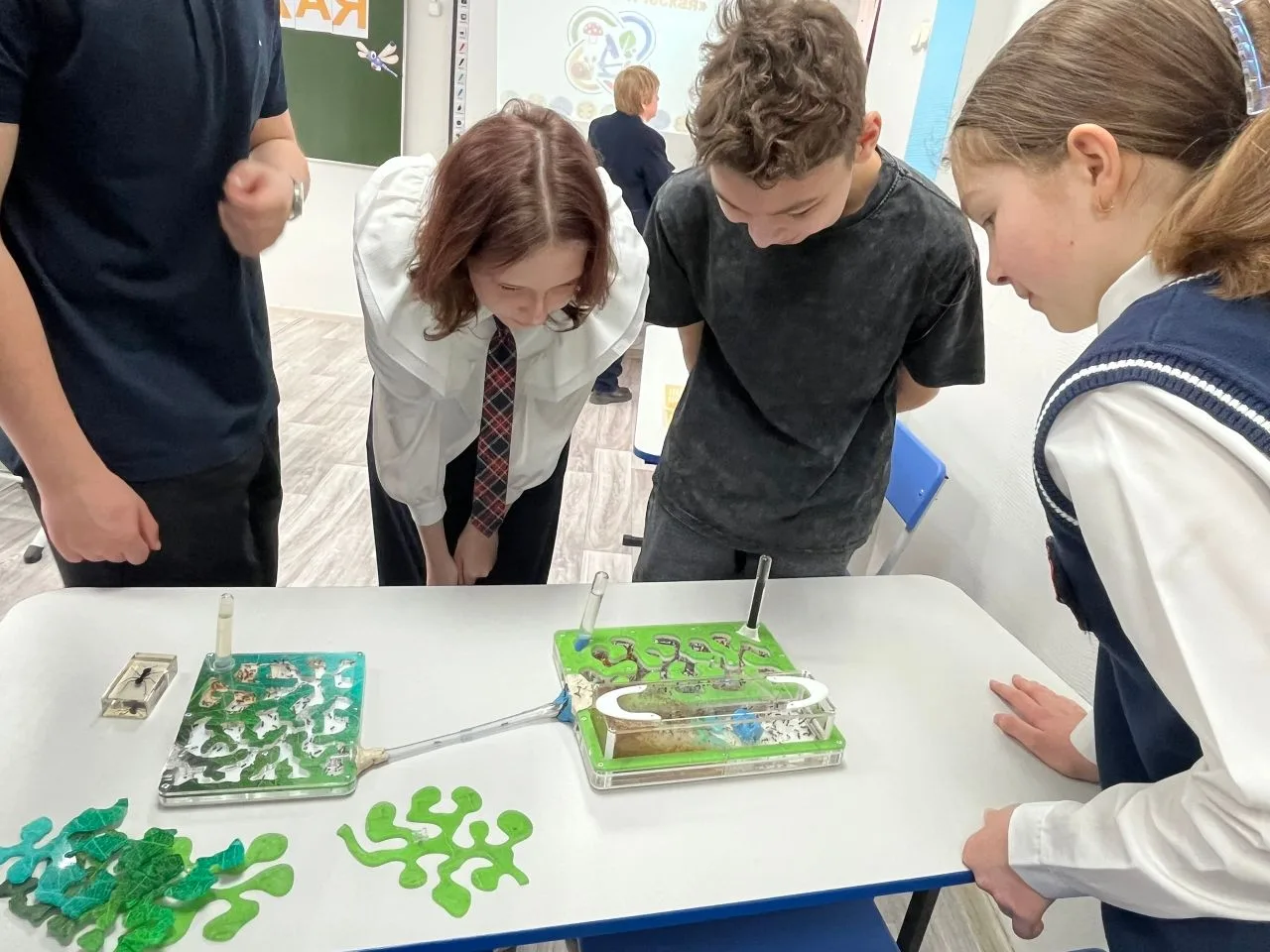 🐌На «Зоологической станции» (учитель Жаркова О.В., учащиеся 7 «Б» класса) гости погрузились в удивительный мир беспозвоночных животных, которые составляют около 97% всех видов живых существ на Земле — от крошечных насекомых до гигантских кальмаров. Они рассмотрели членистоногих под микроскопом, познакомились с муравьиной фермой. Особый восторг вызвало общение с моллюском (улитка Наталья) — ребята кормили его и наблюдали, как он реагирует на прикосновения.