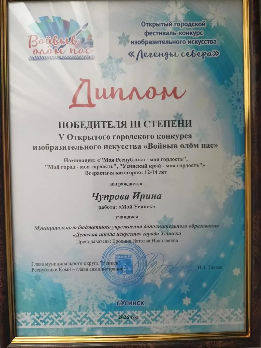 Поздравляем с победой Чупрову Ирину, учащуюся 8в класса, с победой в V открытом городском конкурсе изобразительного искусства «Войвыв олöм пас» — «Легенды Севера» и желаем дальнейших творческих успехов! Награждение состоялось 21 февраля перед началом праздничного концерта, посвящённого Дню Усинского района.