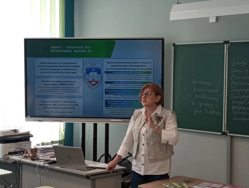Сегодня в рамках профориентационной работы в лицее состоялась встреча учащихся 11 а класса с представителями Марийского государственного университета. Начальник отдела профориентации Юлия Георгиевна Дремина познакомила ребят с направлениями подготовки в университете, условиями и планом приема, сроками подачи документов. Выпускники узнали о том, какие минимальные баллы нужны для поступления в университет и за что можно получить дополнительные баллы.