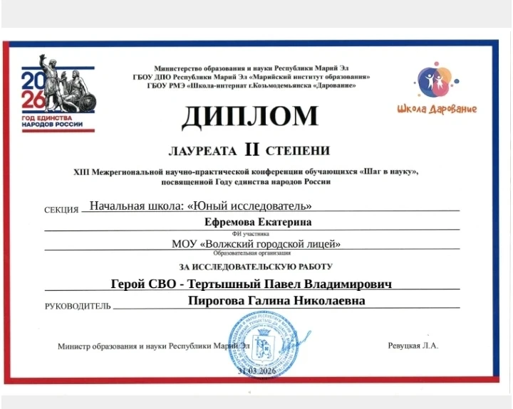 Работа Ефремовой Екатерины "Герой СВО -Тертышный Павел Владимирович" отмечена Дипломом лауреата 2 степени.