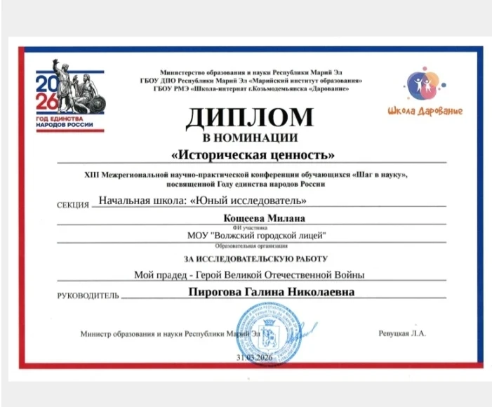 31 марта 2026 года на базе ГБОУ РМЭ "Школа-интернат г. Козьмодемьянска "Дарование" прошла XIII межрегиональная научно-практическая конференция для обучающихся «Шаг в науку», посвященная Году единства народов России.