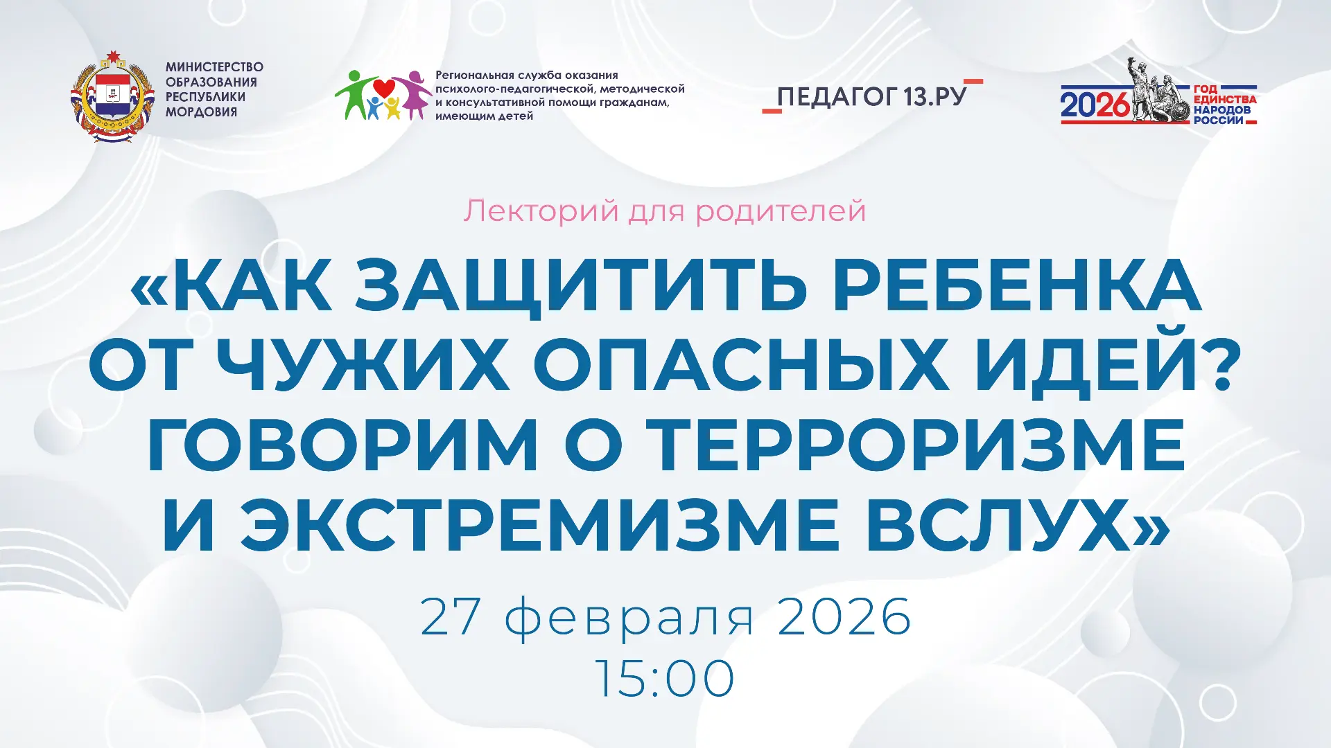 27 февраля 2026 года в 15:00 Региональной службой консультирования родителей на базе ЦНППМ «Педагог 13.ру» проводится лекторий для родителей «Как защитить ребенка от чужих опасных идей? Говорим о терроризме и экстремизме вслух».