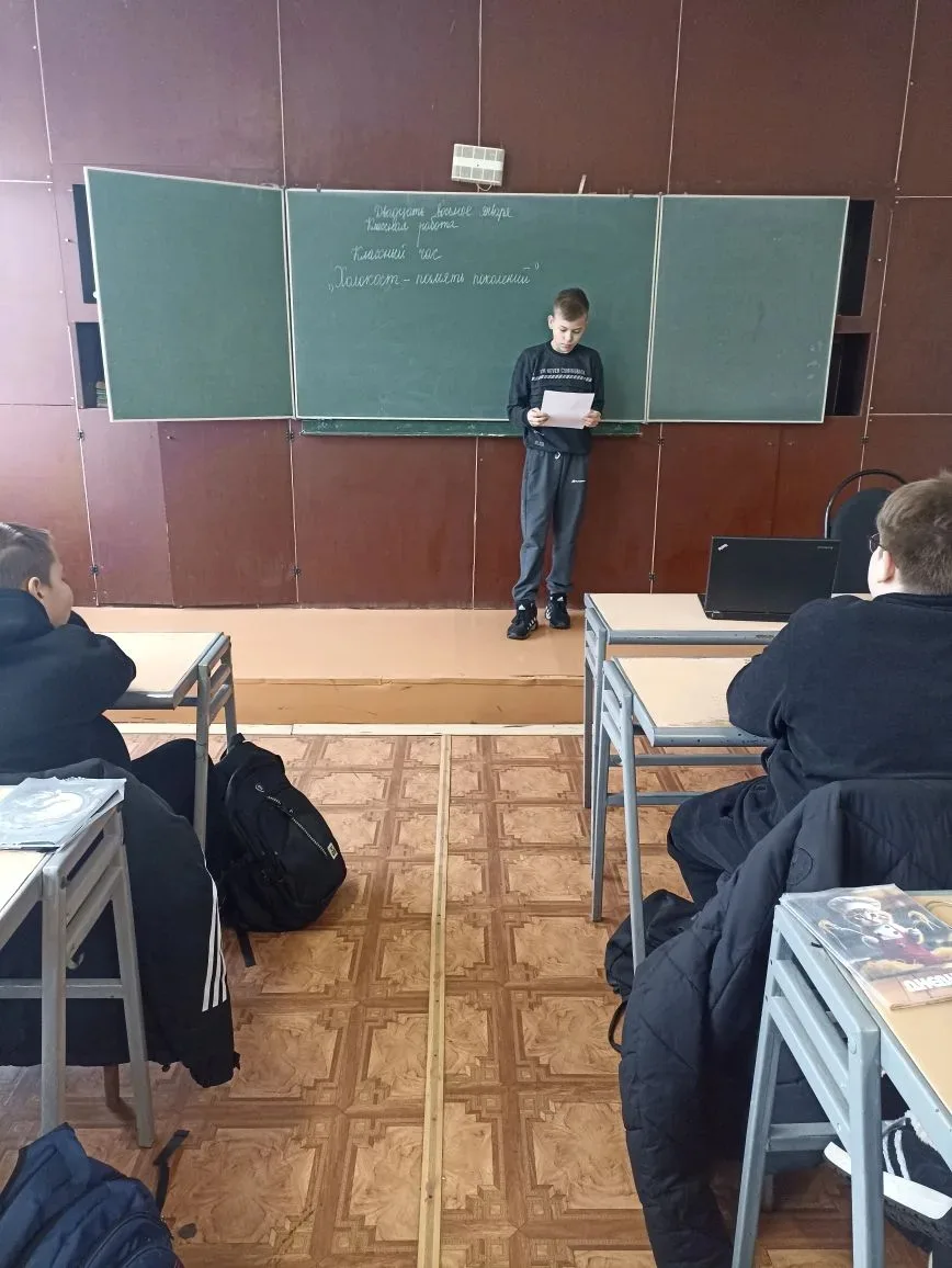 В 5 классе прошёл классный час, посвящённый Международному дню памяти жертв Холокоста. Эта памятная дата призвана напомнить о масштабном геноциде в мировой истории.