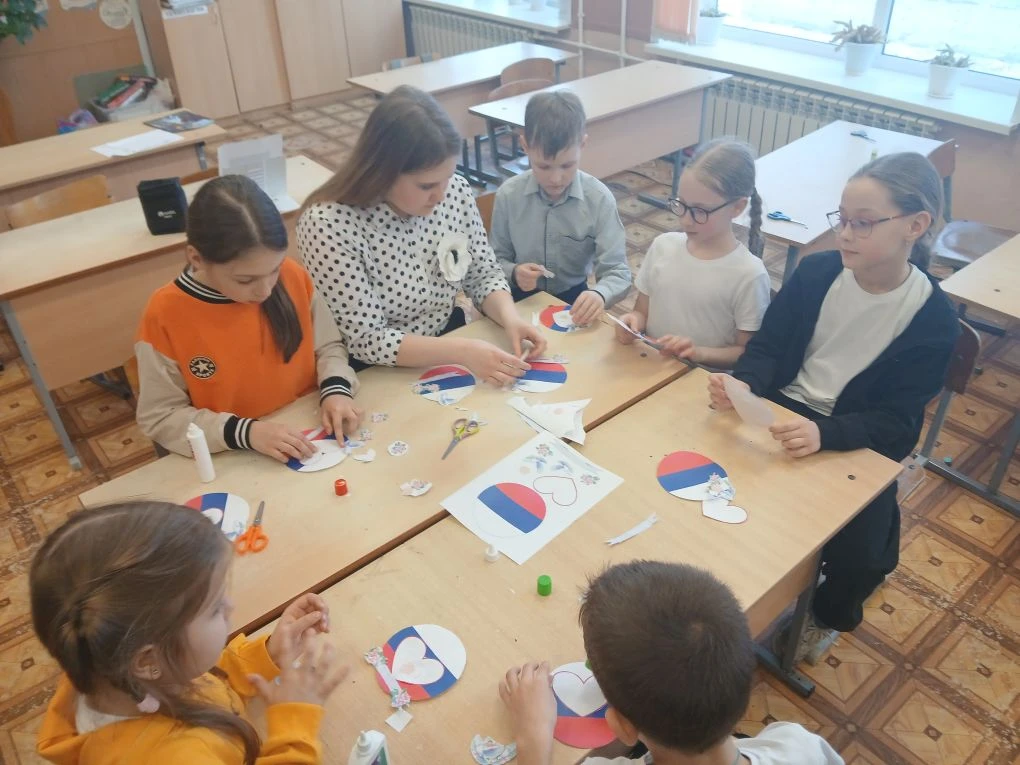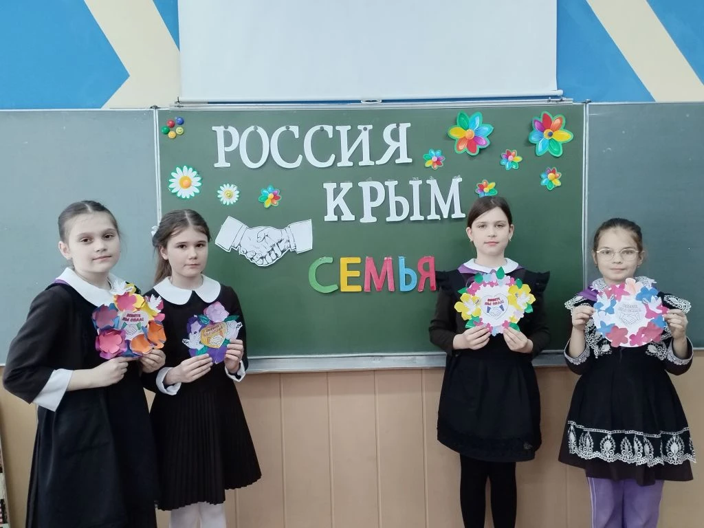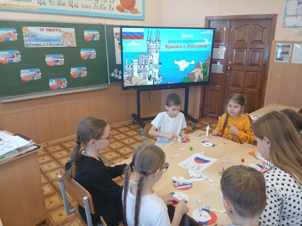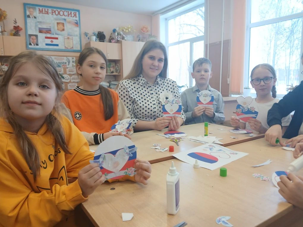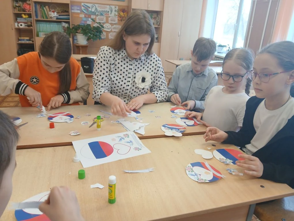 18 марта в МБОУ "Гимназия №1" Ковылкинского муниципального района советник директора по воспитанию Игольникова Т.С. провела мастер-класс по изготовлению открытки-аппликации для учащихся начальной школы в честь празднования великой даты - 12-й годовщины воссоединения Крыма с Россией.