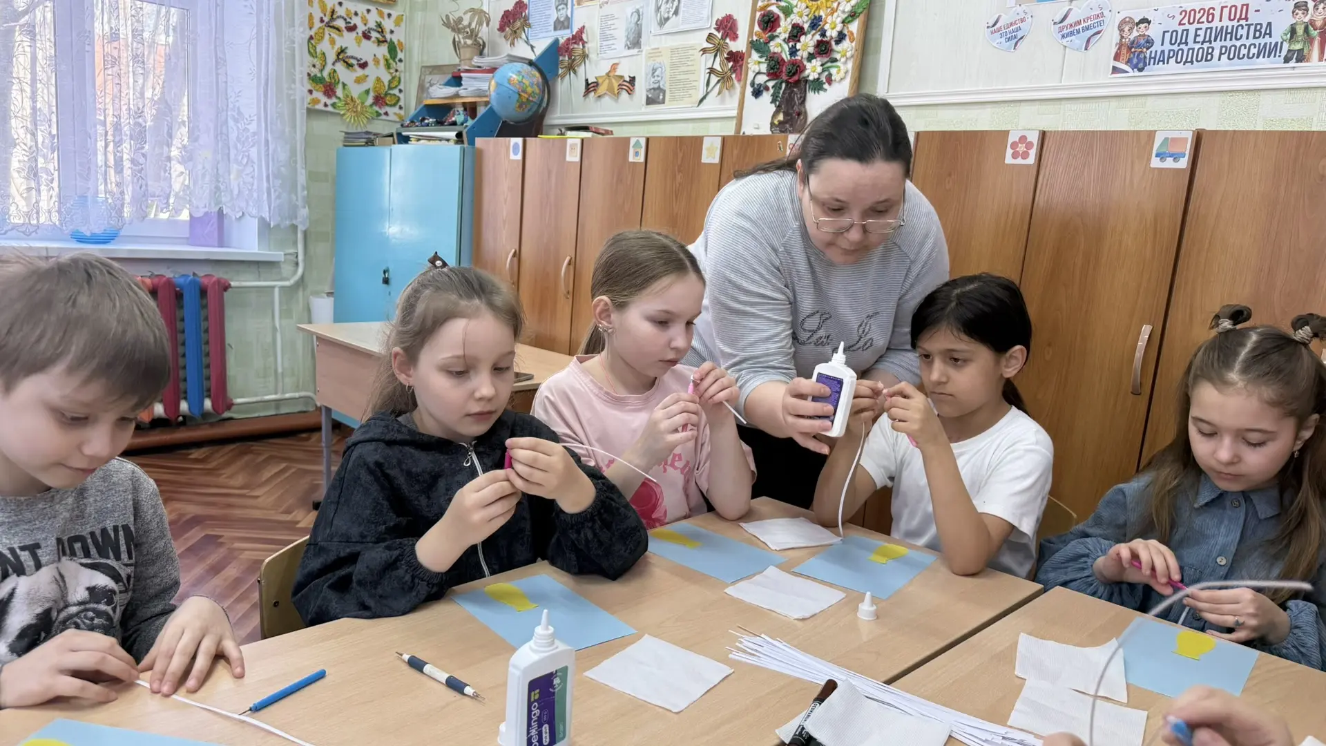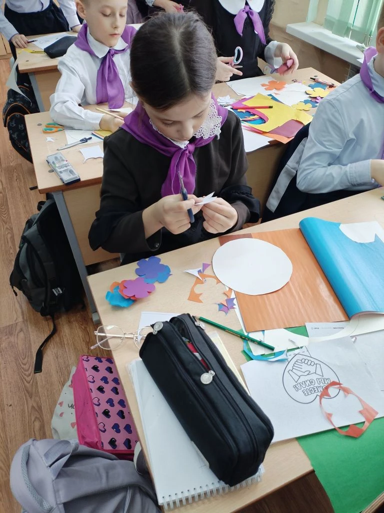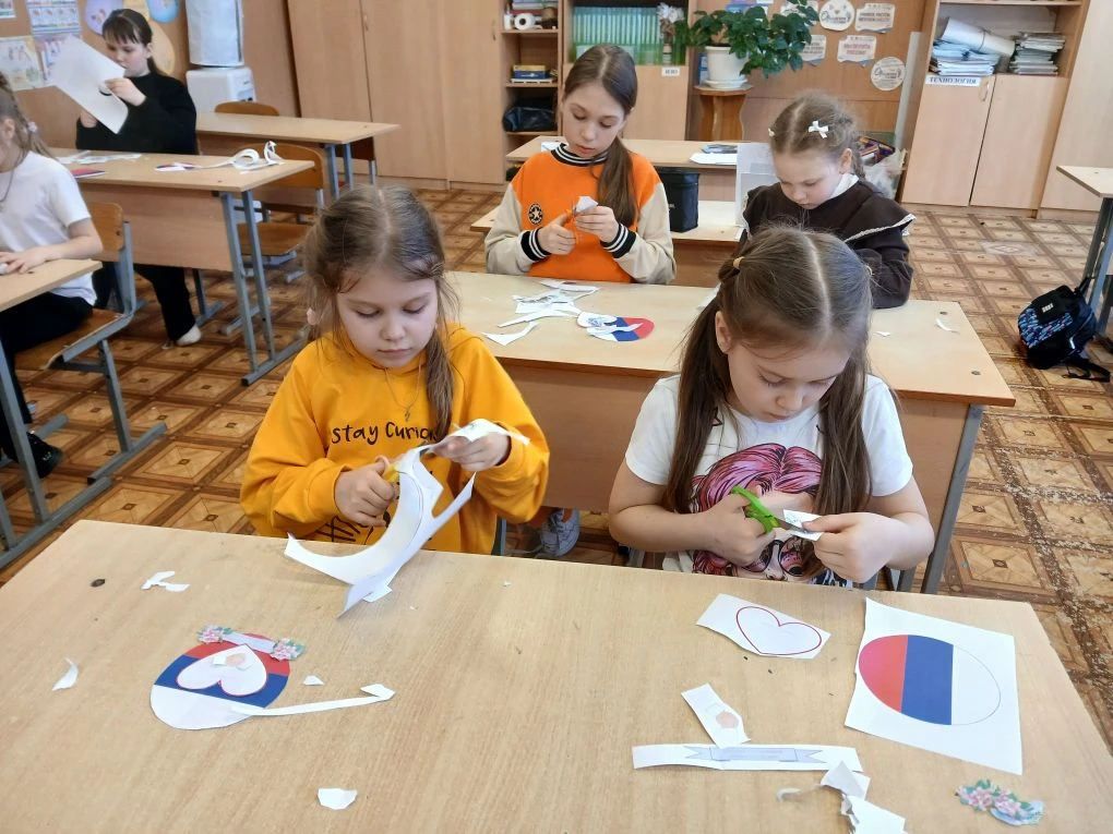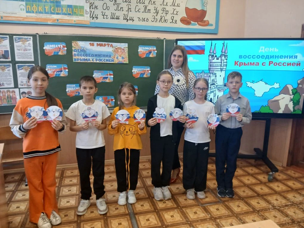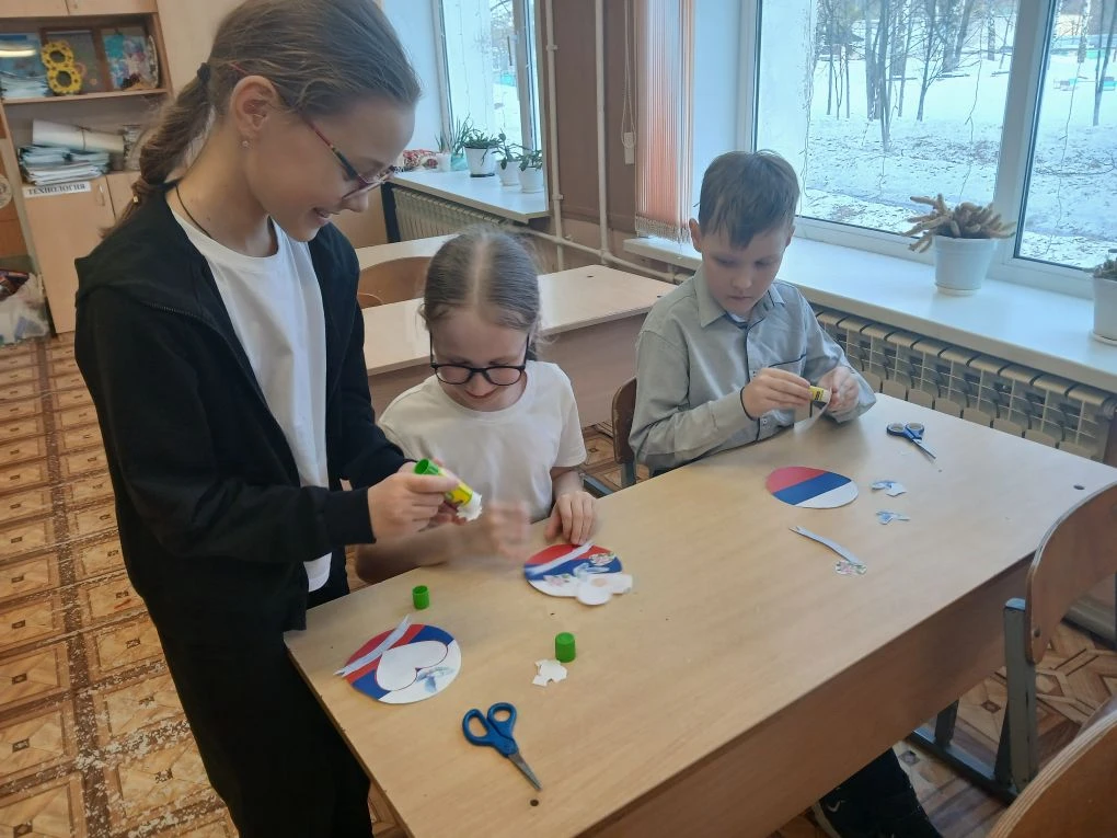 18 марта в МБОУ "Гимназия №1" Ковылкинского муниципального района советник директора по воспитанию Игольникова Т.С. провела мастер-класс по изготовлению открытки-аппликации для учащихся начальной школы в честь празднования великой даты - 12-й годовщины воссоединения Крыма с Россией.