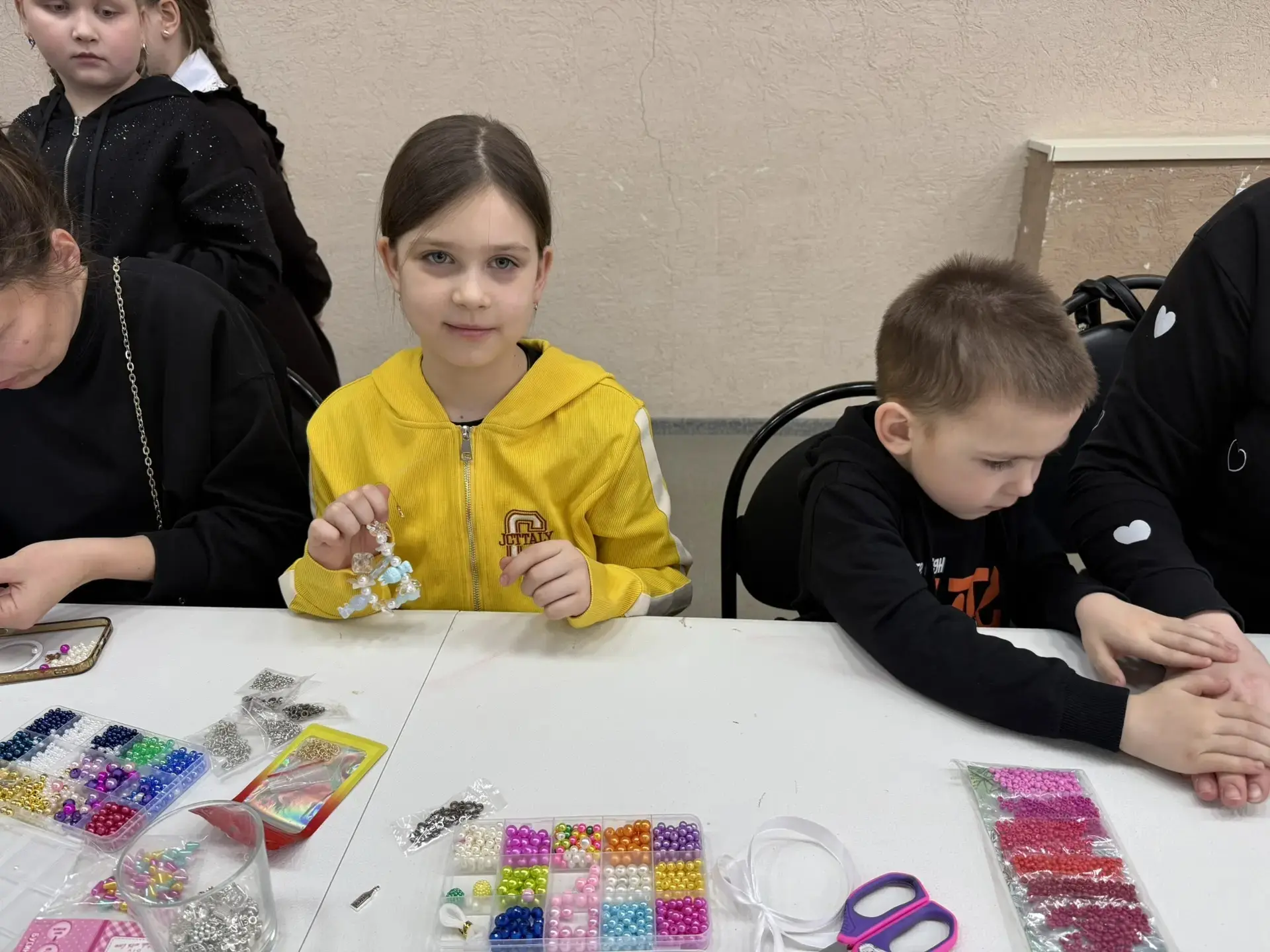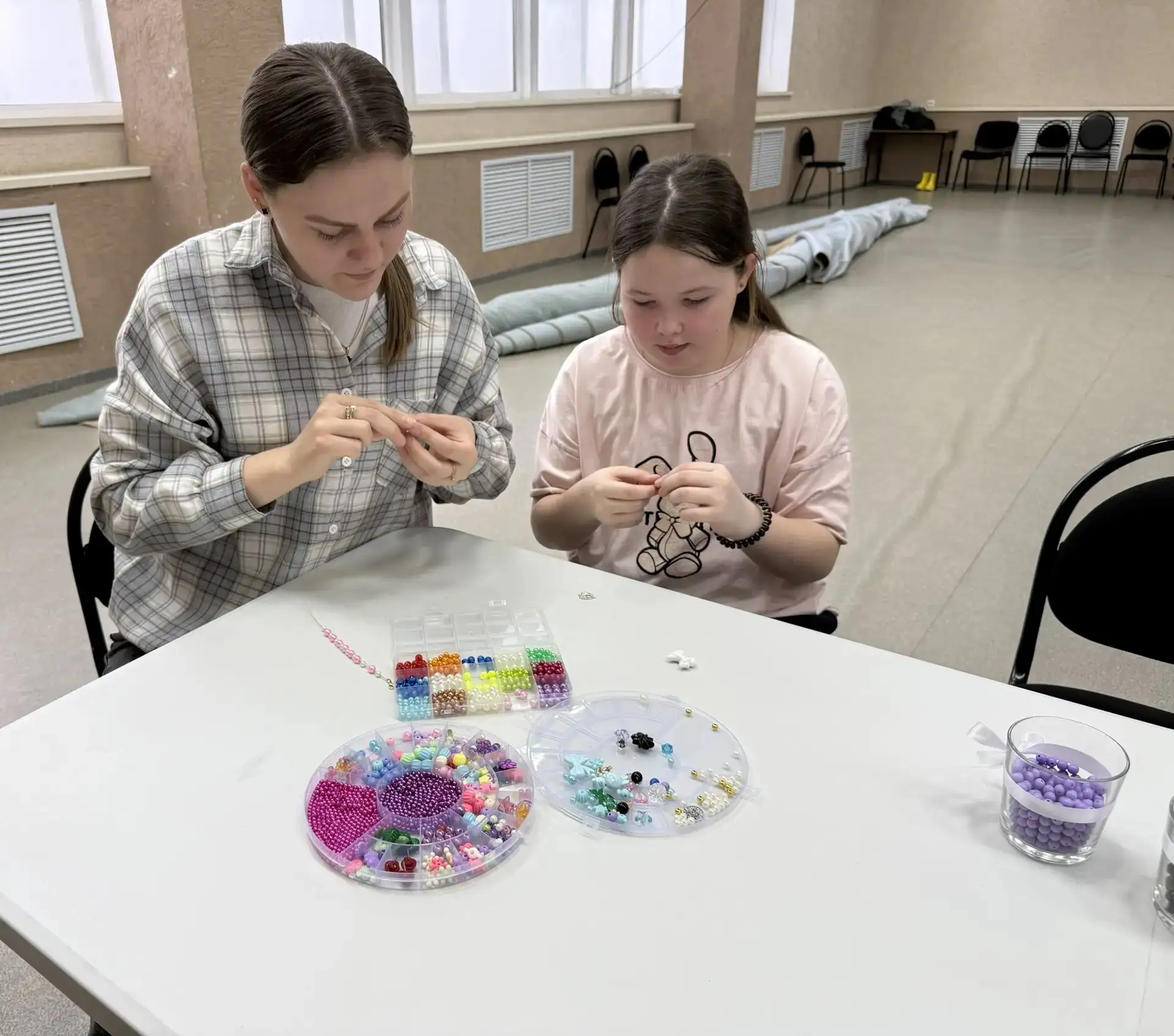 Ребята вместе со своими мамами увлечённо включились в работу: каждый смог сделать браслет по своему усмотрению, используя бусины разного цвета, формы, величины. У каждого участника мероприятия остался на память о замечательном времяпрепровождении яркий браслет.