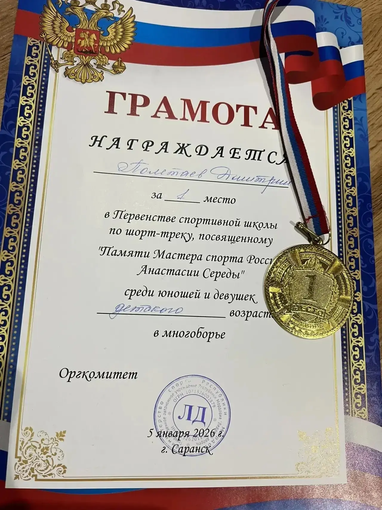 На первенстве СШОР по конькобежному спорту (шорт-трек) памяти А. Середы, которые проходили 5 января в г. Саранск, ученик 4А класса Полетаев Дмитрий занял 1 место среди юношей 9-11 лет!