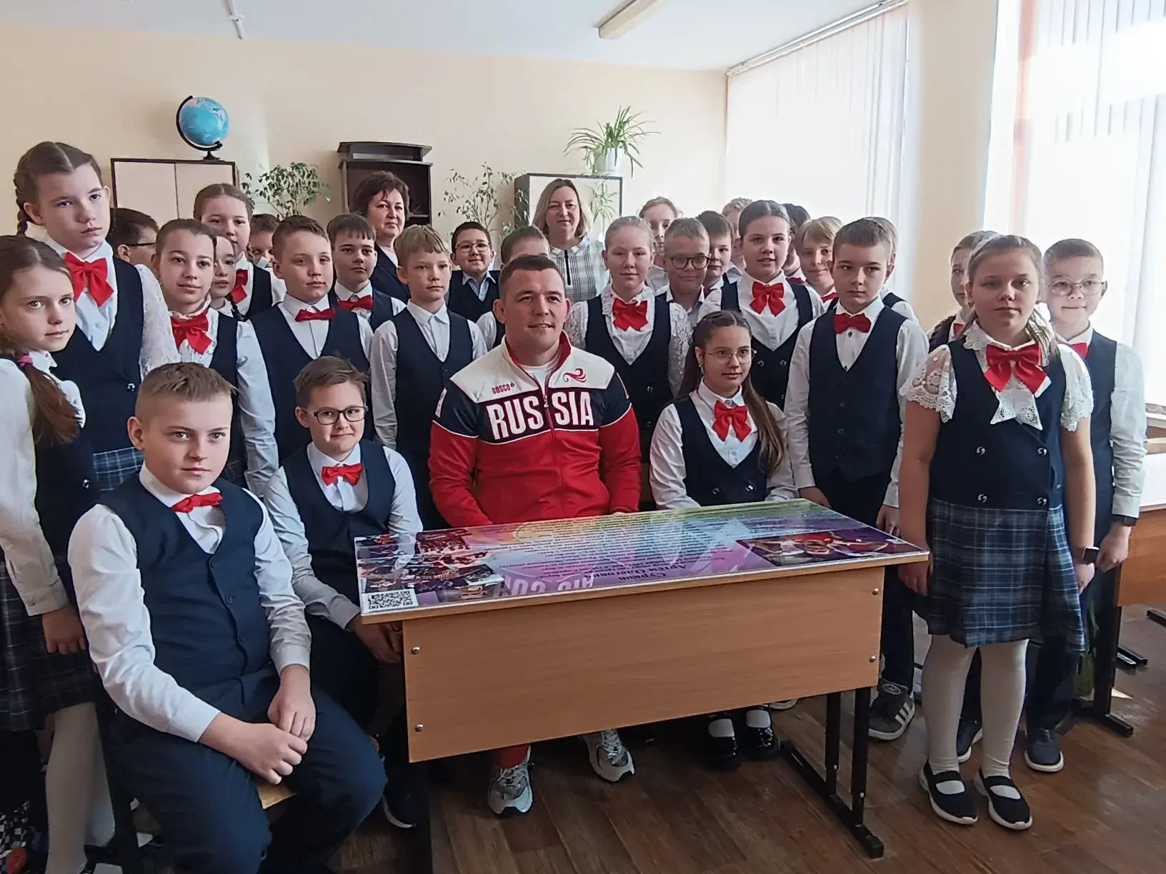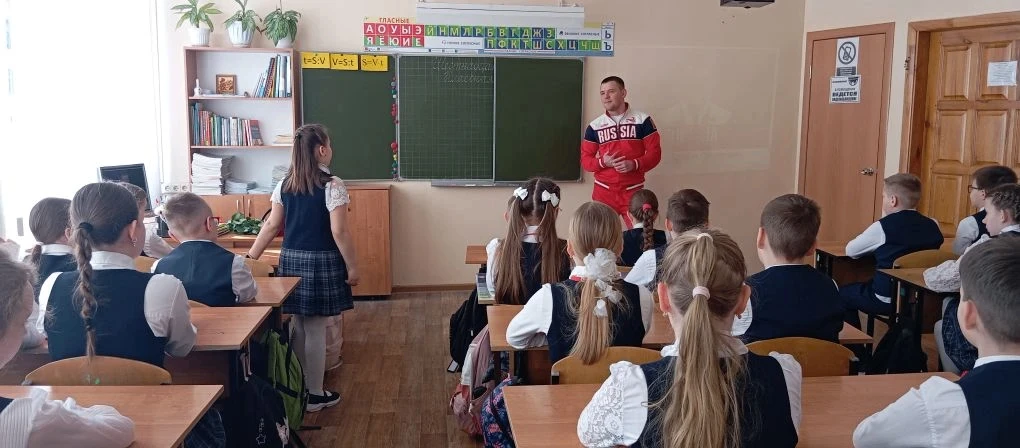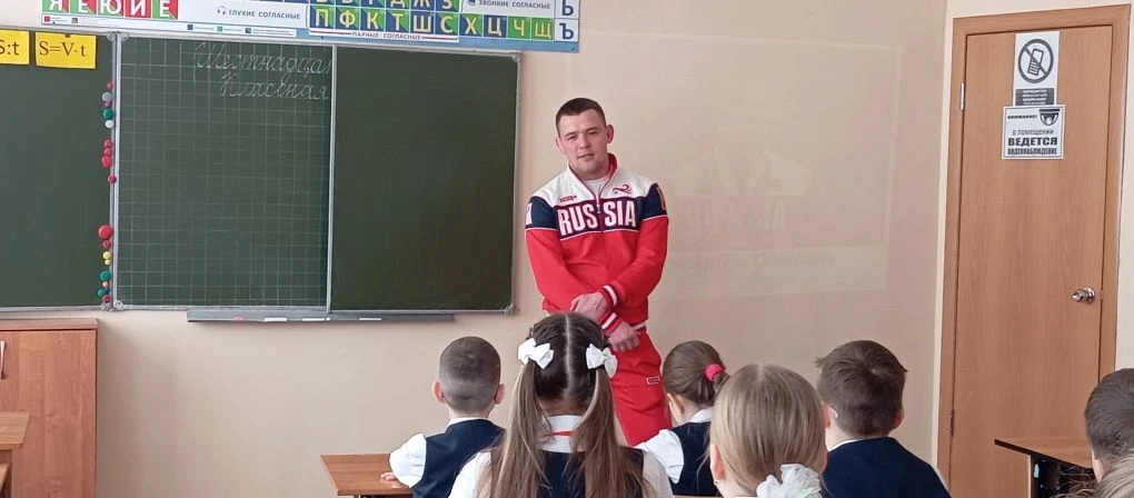 На линейке присутствовал почетный гость - российский борец по греко-римской борьбе, Чемпион Европы, Чемпион мира, заслуженный мастер спорта России, выпускник нашей школы 2020 года Сурков Артем Олегович.