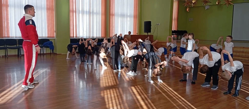 Чемпион предложил всем присутствующим сделать зарядку, на которой ребята выполняли различные упражнения под музыку и получился настоящий «Флешмоб».