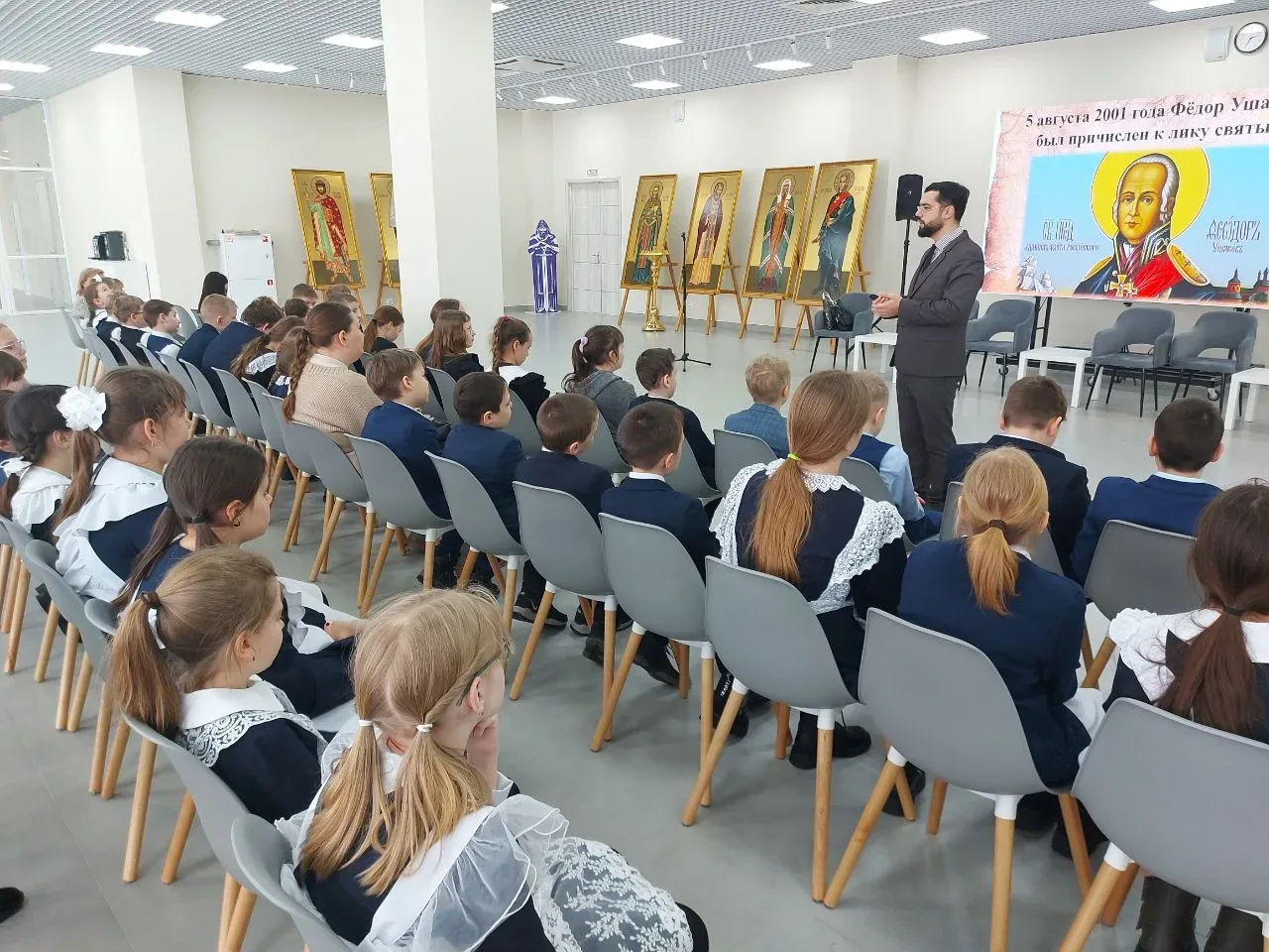 🇷🇺Четвероклассники нашей школы побывали в Духовно-просветительском центре на занятии из цикла "Россия - моя история" по теме "Непобедимый адмирал Фёдор Фёдорович Ушаков". ⚓Это мероприятие было посвящено 25-летию канонизации святого праведного воина, адмирала, выдающейся личности в истории российского флота - Ф. Ф. Ушакова. ⚓Школьники познакомились с житием и подвигами прославленного флотоводца. В ряду флотоводцев имя Ф. Ушакова занимает первое место. Он не проиграл ни одного сражения на море, не потерял, ни одного корабля, ни один из его подчинённых не оказался в плену. Пример великих созидателей и защитников Отечества вдохновляет нас и сегодня продолжать их великое дело - служить нашей Родине. В ходе беседы ребятам предлагали задуматься о своём месте в жизни страны и о том, какой вклад они могут внести в её будущее.