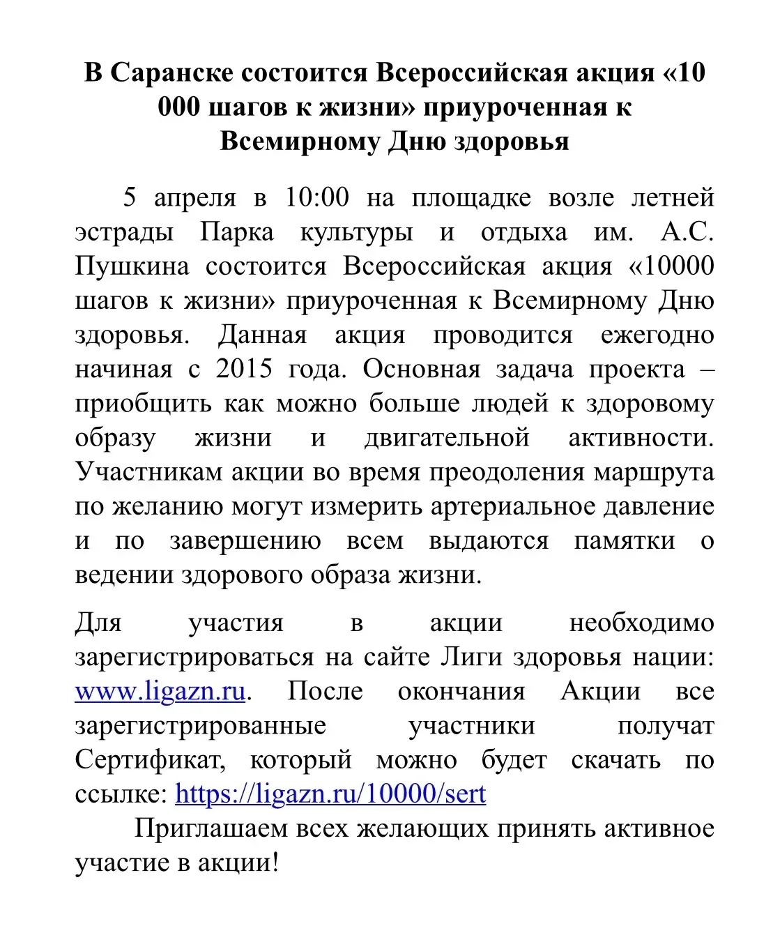 📌 В Саранске 5 апреля состоится Всероссийская акция «10 000 шагов к жизни», приуроченная к Всемирному Дню здоровья.