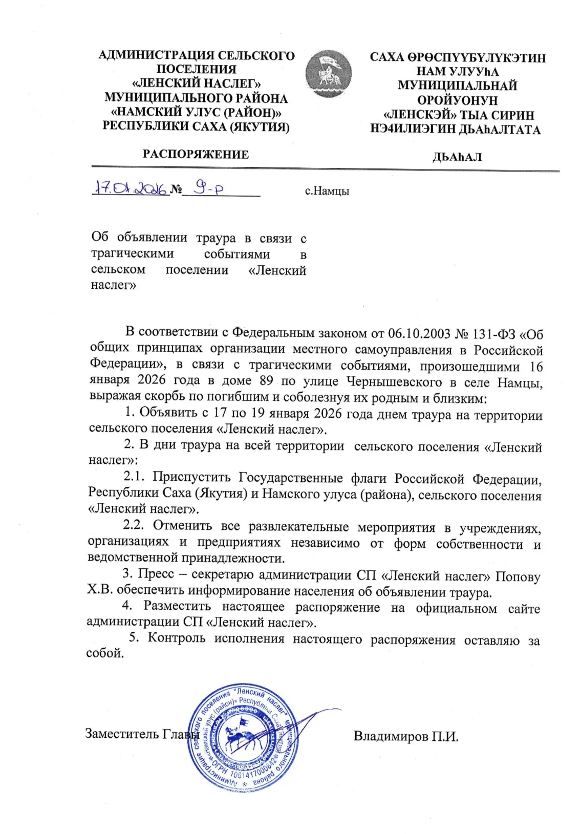 Тохсунньу 17-19 күннэригэр траур биллэрилиннэ