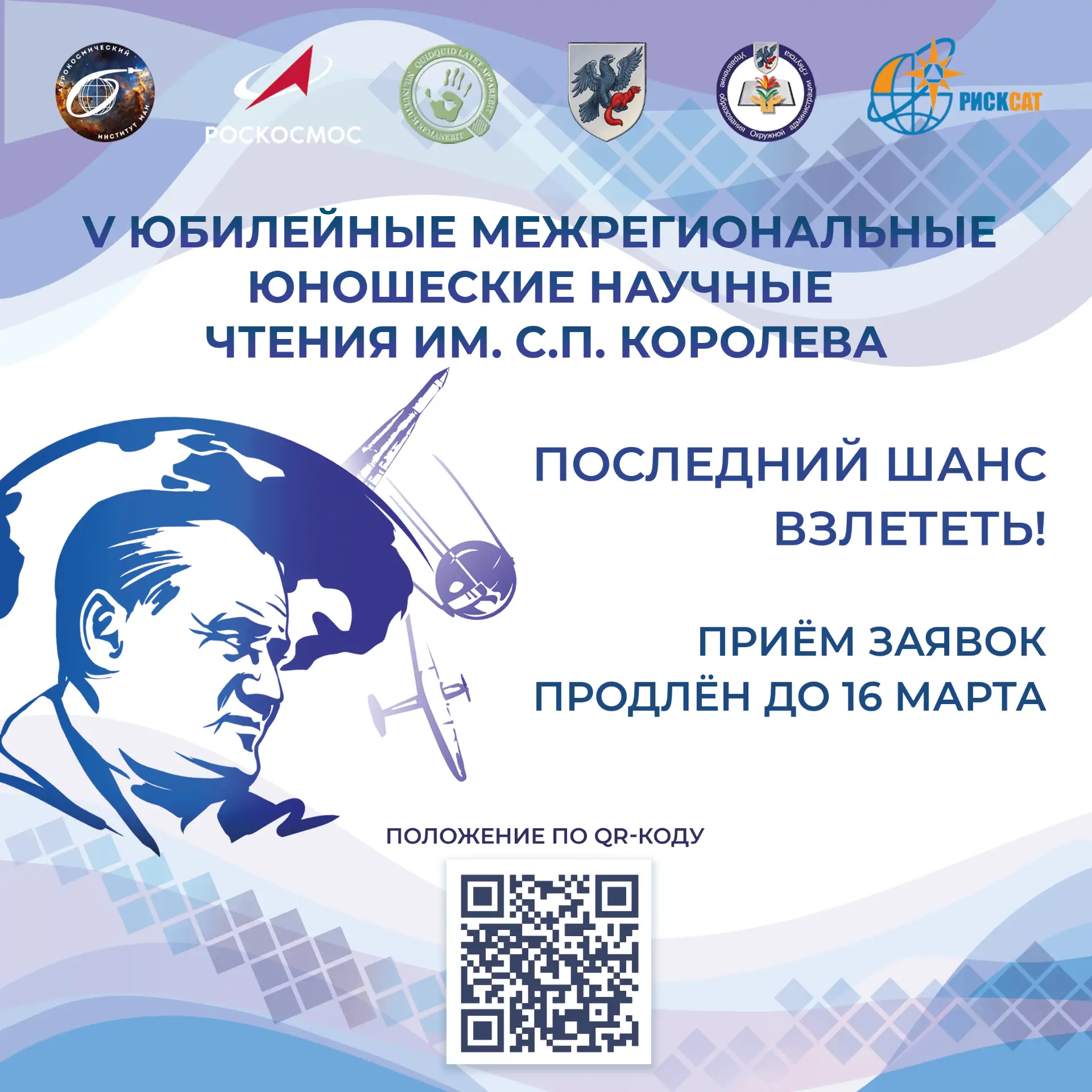 ВНИМАНИЕ❗️ПРИЕМ ЗАЯВОК НА УЧАСТИЕ в V юбилейных межрегиональных юношеских научных чтений им. С.П. Королева ПРОДЛЕН ДО 16 МАРТА❗️