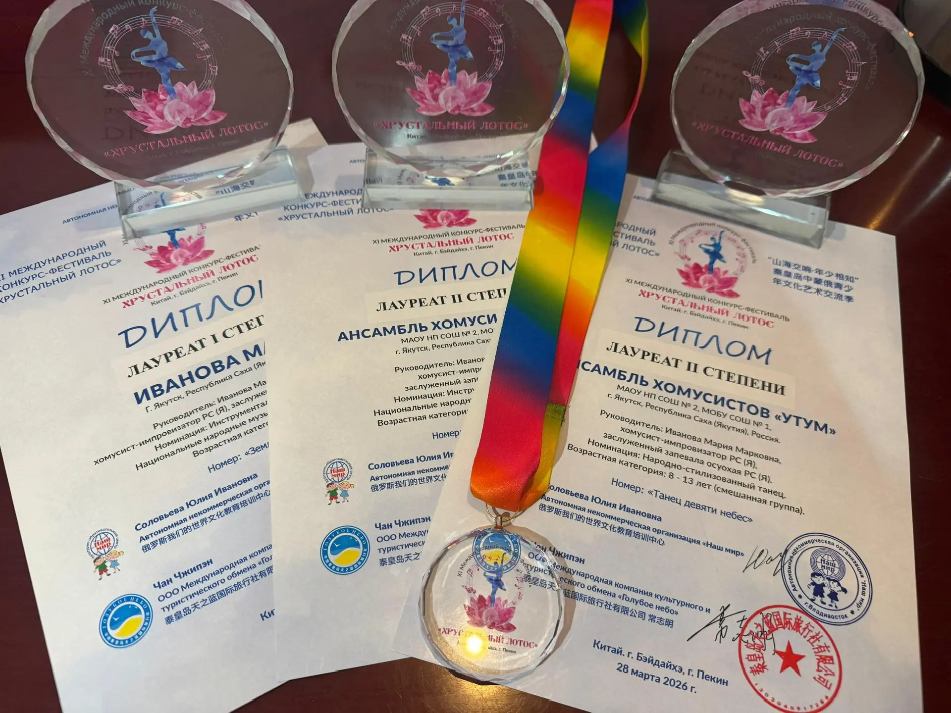 Улуу Кытай сиригэр *Аан дойдутааҕы "Хрустальный лотос"* фестиваль күрэҕэр хомус алыптаах дорҕоонун, Айыыларга сүгүрүйэр оһуохайбытын, тойукпутун иһитиннэрэн *Лауреат 2 үрдэлэ* үрдүк аатын ситистилэр 💫🤗☀️❤️