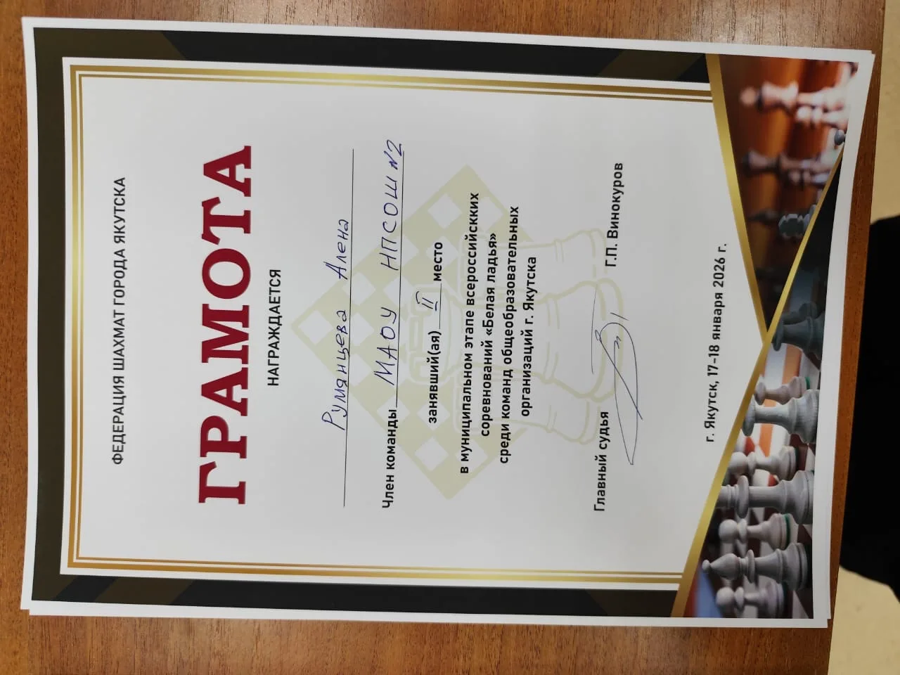 В команде очень хорошо выступила Алиса Харлампьева, выигравшая все 7 партий, — абсолютно лучший результат турнира! Хорошо показали себя и наши мальчики, набравшие 3,5 очка на первой и 5 очков на третьей досках. Чуть большего мы ожидали от Алёны Румянцевой. Она набрала 4,5 очка, что тоже неплохо, если учесть, что на второй доске она играла с юношами. Конечно, почти у всех были и упущения. Но, как говорится, на ошибках учатся. Ведь каждая сыгранная партия — это бесценный урок. До начала республиканского этапа нужно будет поработать над исправлением погрешностей.