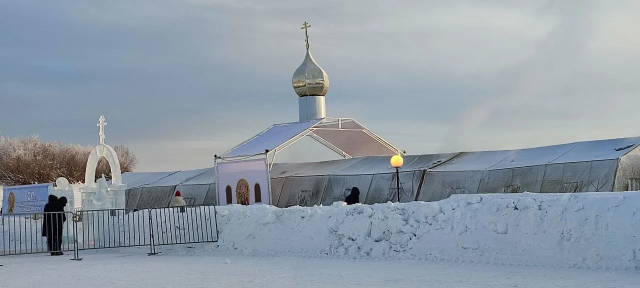 🔹 По информации Якутского гидрометцентра, в 13 часов температура воздуха в Якутске составила минус 34 градуса. Для обеспечения комфорта верующих и всех желающих принять участие в купаниях на Зеленом лугу установлены четыре палатки, включая палатки для купания, раздевалки и полевую кухню.