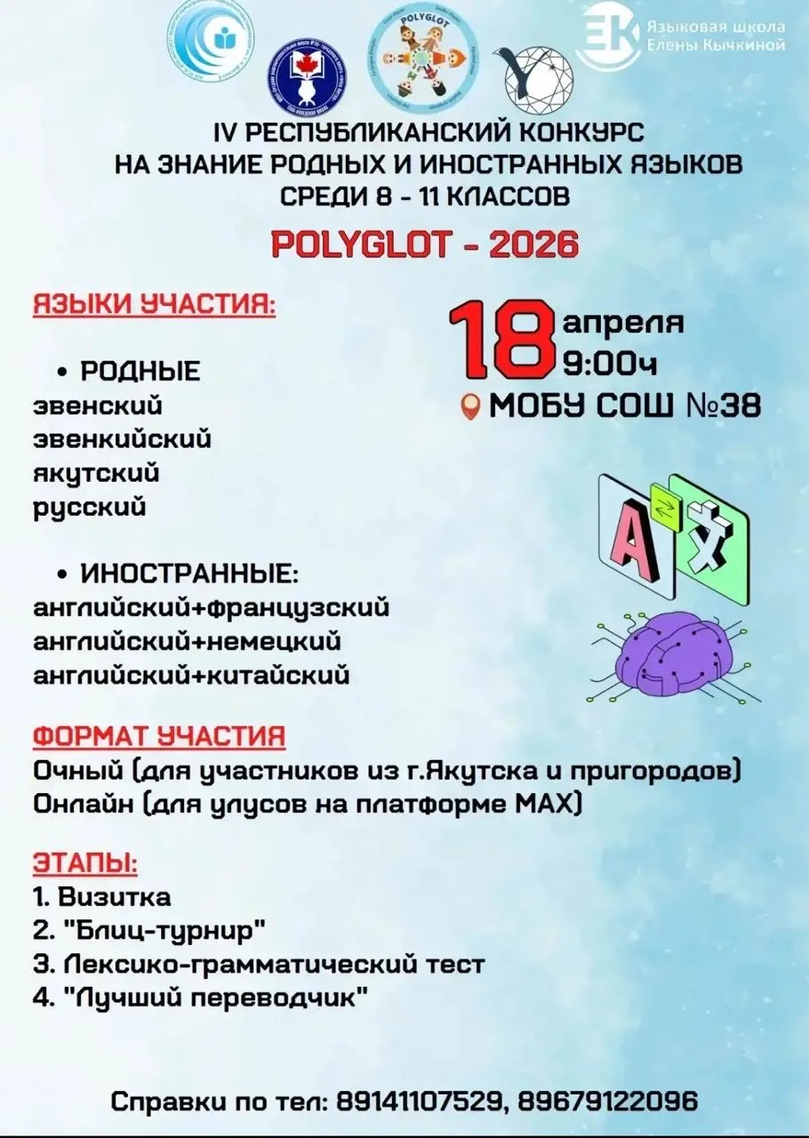 МОБУ СОШ №38 (с углубленным изучением отдельных предметов) совместно с Языковой школой Елены Кычкиной, СВФУ им.М.К.Аммосова, АОУ РС (Я) ДПО ИРОиПК им. С.Н. Донского объявляет о проведении IV Республиканского конкурса «Полиглот» среди учащихся 8-11 классов.