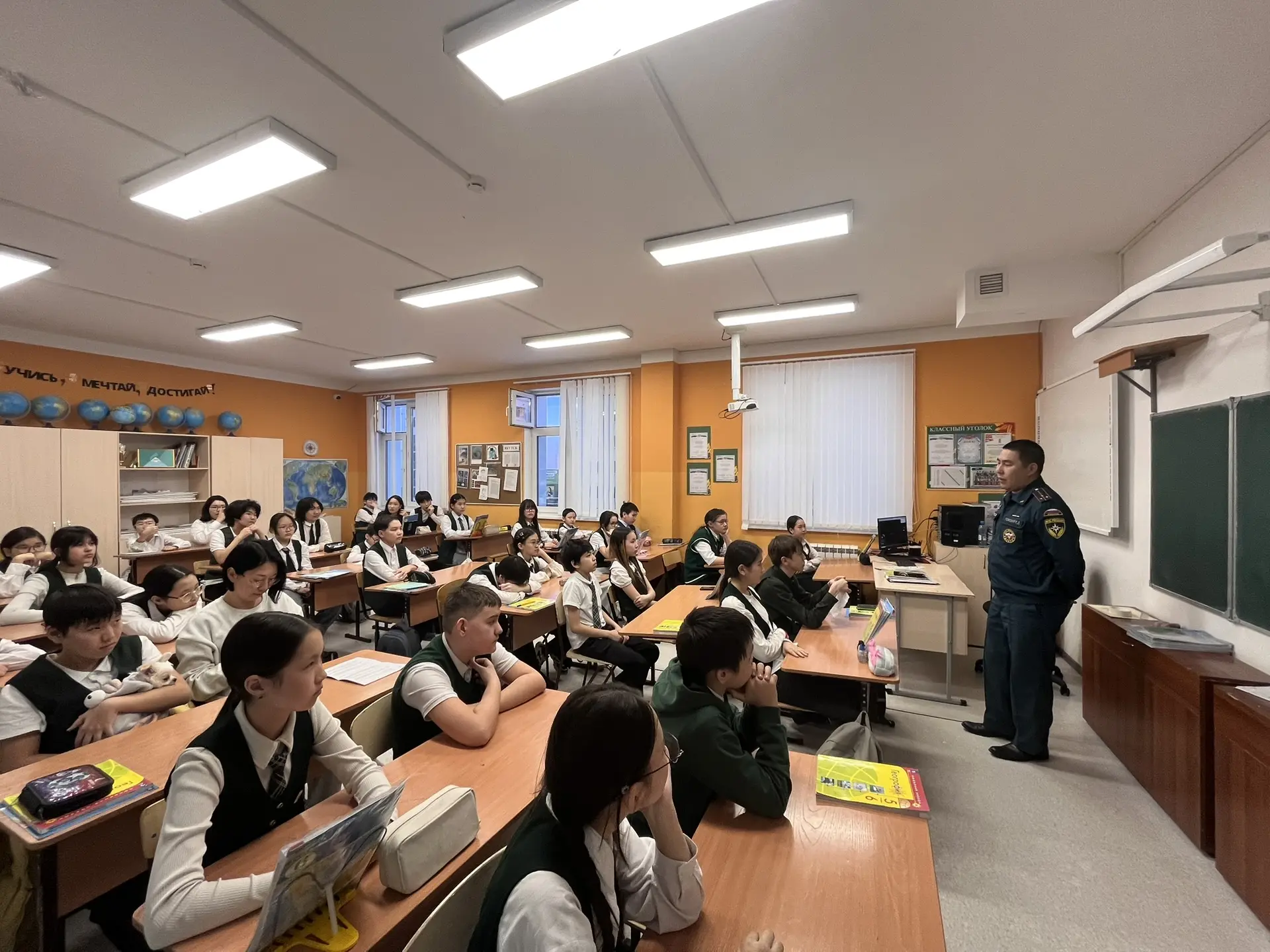 Вторым гостем стал сотрудник МЧС. Он не только увлекательно описал работу спасателей, но и напомнил школьникам о ключевых правилах безопасности: поведении при пожаре, действиях в чрезвычайных ситуациях и важности сохранения спокойствия в опасных ситуациях.
