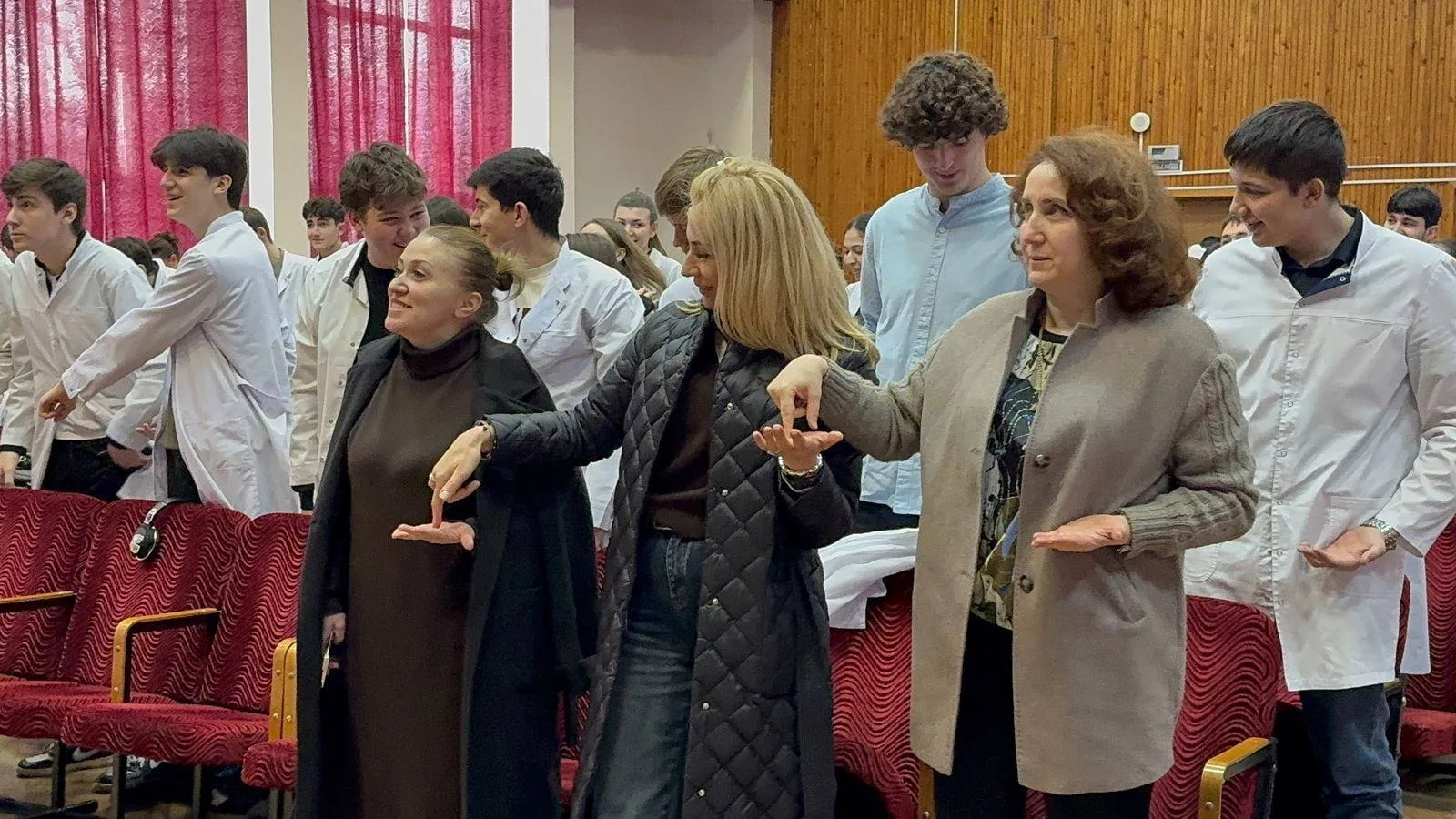 А как приятно было услышать от неё слова восхищения в адрес нашего ректора! Всем собравшимся она пожелала здоровья, отличной учебы, рекомендовала читать стихи К. Симонова, Шекспира, О. Хаяма, М. Ю. Лермонтова и, конечно, всеми любимого Коста!