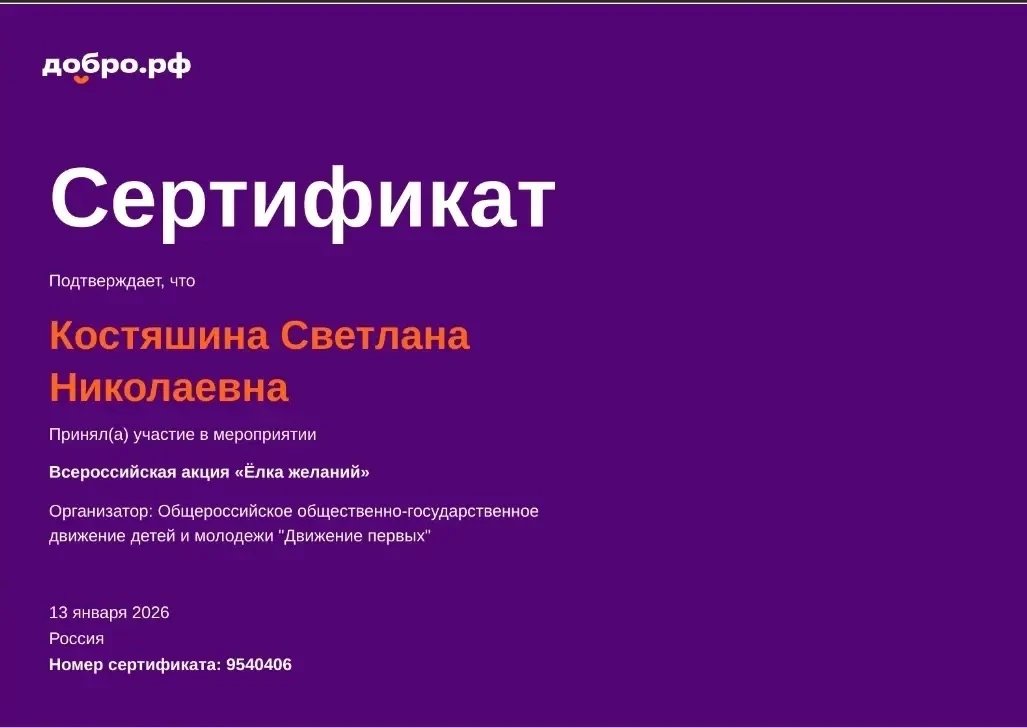 📣 Активистка первичного отделения «Движение первых» ГАПОУ СОГТЭК Светлана Костяшина получила сертификат за участие во Всероссийской акции «Ёлка желаний».