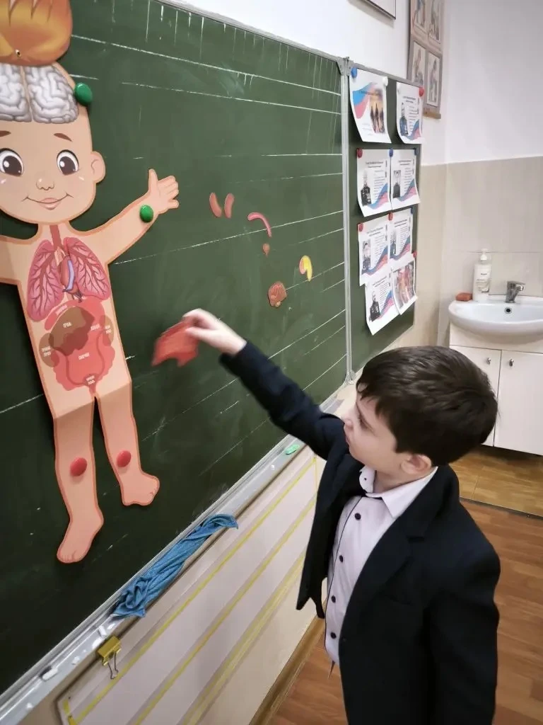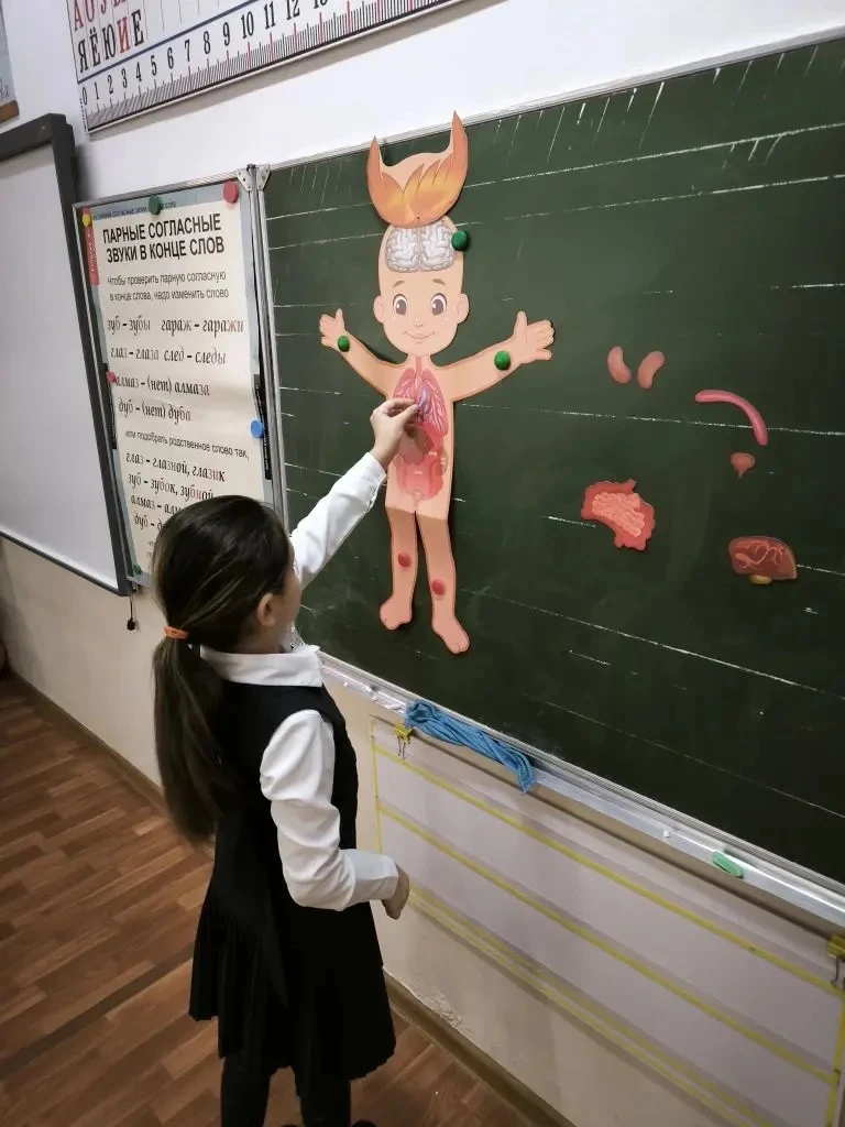 Ребята подготовили яркие макеты человека и внутренних органов 🫀🫁🧠, не только узнали об их предназначении, но и активно участвовали в определении их расположения. Каждый сверял свой макет с образцом на доске 📋✅ — получилось очень познавательно и увлекательно!