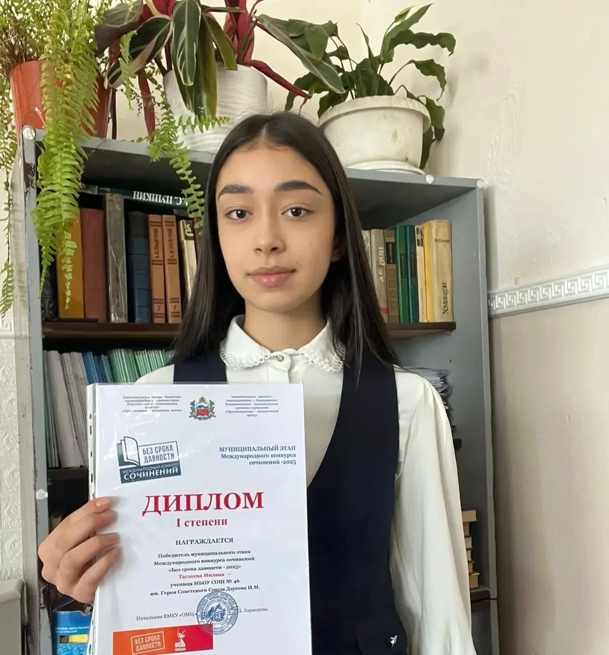 🏆 Тагзиева Милана, 9 «Г» — Победитель муниципального этапа Международного конкурса сочинений «Без срока давности - 2025»! Твоя победа — это гордость нашей школы! 🌍📝 Ты сумела проникнуться важной темой памяти и истории, показав свое понимание и уважение к прошлому. Желаем тебе дальнейших успехов и вдохновения!