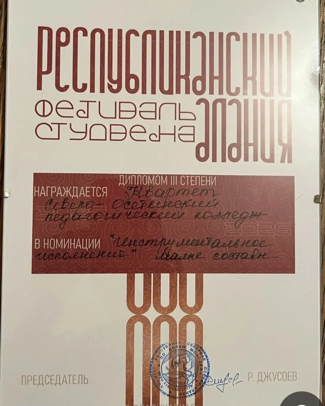 В программе концерта прозвучали хоровые сочинения в исполнении хора студентов Северо-Осетинского педагогического колледжа «Алутон» под руководством преподавателя ПЦК музыкального образования, Заслуженного работника образования и культуры РСО-Алания Л.С.Мамуковой.