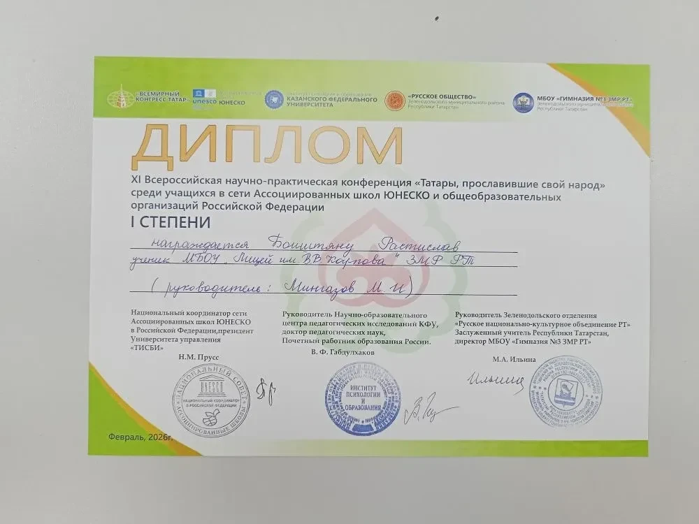 Сегодня На XI Всероссийской научно-практической конференции «Татары, прославившие свой народ» ученик 5к класса Боиштяну Растислав занял 1 место. Руководитель Мингазов М.И.