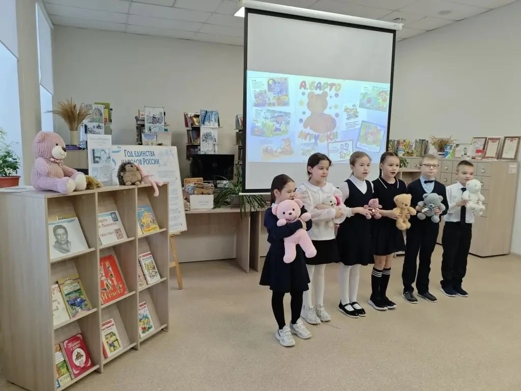 Ребята пришли в библиотеку не с пустыми руками — они принесли СВОИ любимые игрушки. Как же здорово было увидеть рядом с книгами плюшевых мишек, зайчат и даже игрушечные грузовики! Ведь для Агнии Барто игрушки — это маленькие друзья, которые переживают с нами первые радости и трудности.
