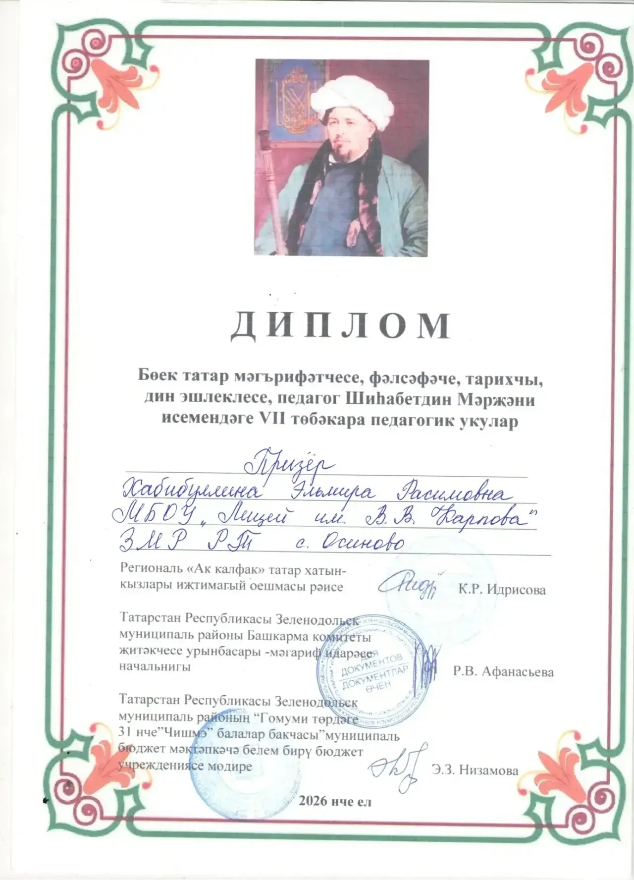 Бөек татар мәгърифәтчесе, фәлсәфәче, тарихчы, дин эшлеклесе, педагог Шиһабетдин Мәрҗәни исемендәге VII төбәкара педагогик укуларда "В.В.Карпов исемендәге лицей" учреждениесенең беренче категорияле татар теле һәм әдәбияты укытучысы Хәбибуллина Эльмира Рәсим кызы Призёр дәрәҗәсенә лаек булды.