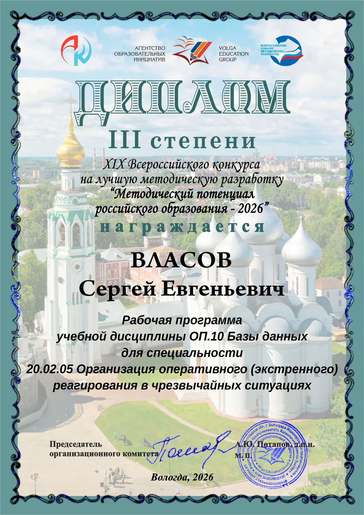 Наш преподаватель - Власов Сергей Евгеньевич принял участие в XIX Всероссийском конкурсе «Методический потенциал российского образования — 2026» ✨