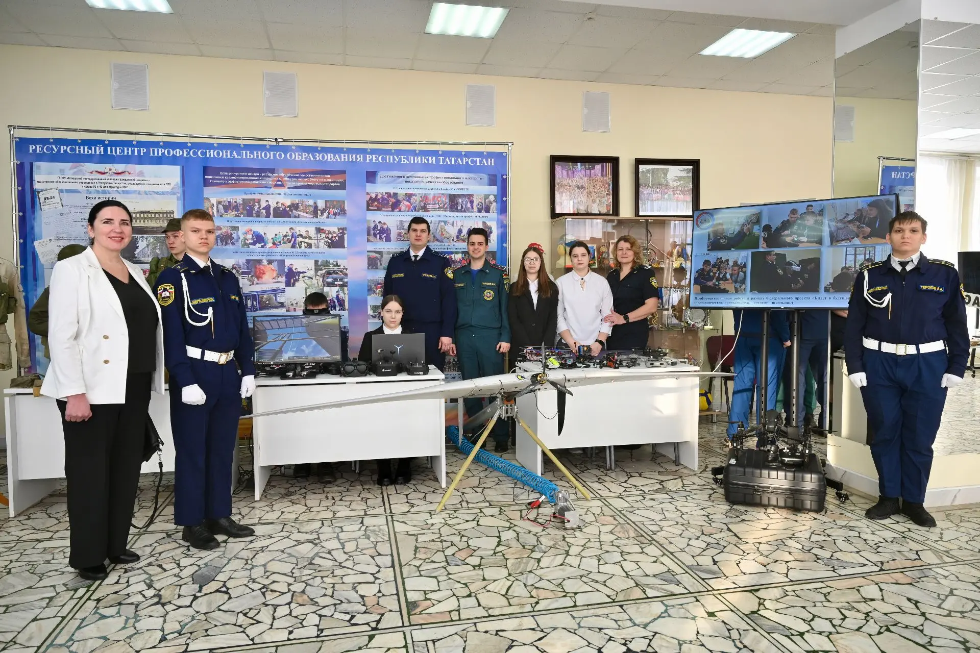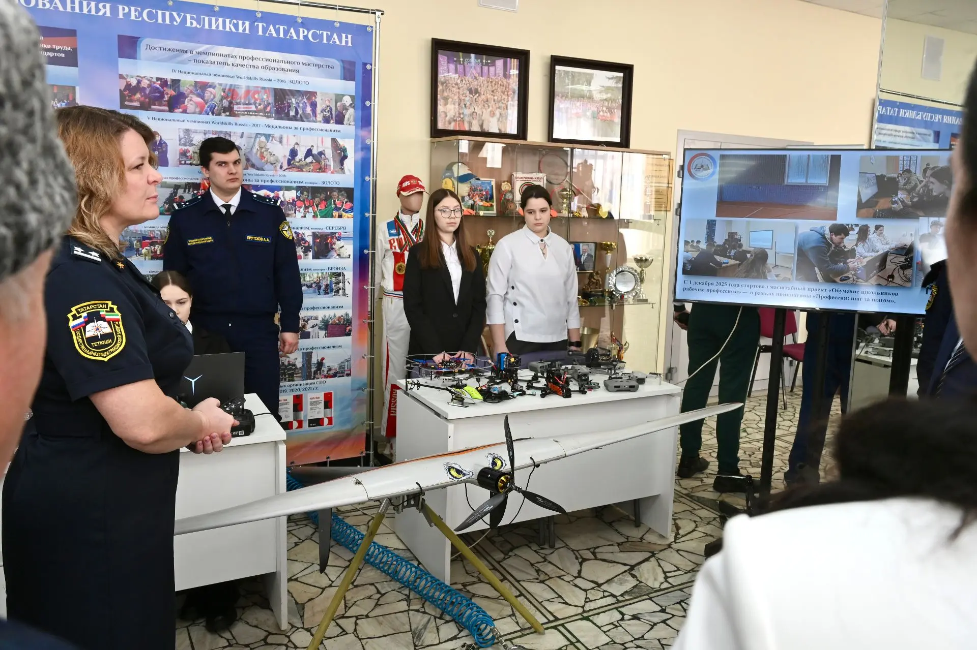Демонстрация подготовки колледжем кадров операторов БПЛА на районной выставке в г. Тетюши 4 февраля 2025 г. в рамках расширенного заседания Совета Тетюшского муниципального района по итогам работы в 2025 году, с участием первого заместителя Премьер-министра РТ Рустама Нигматуллина, депутата Государственной Думы Федерального Собрания РФ, первого заместителя председателя Комитета Государственной Думы по делам национальностей Ильдара Гильмутдинова. Автор видео Игорь Зарубин.