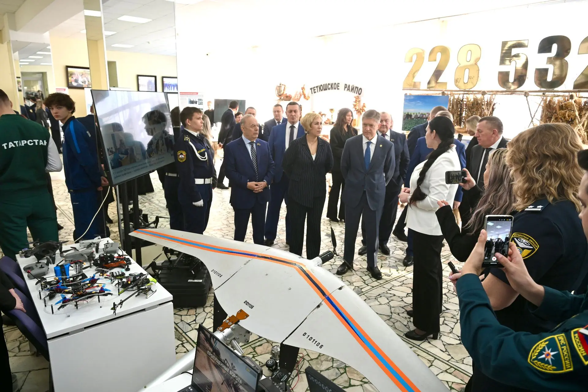 Ещё до начала мероприятия в фойе РДК открылась выставка достижений ведущих организаций района. Особое внимание привлёк стенд Тетюшского государственного колледжа гражданской защиты, представившего перспективное направление — подготовку кадров в сфере беспилотной авиации.