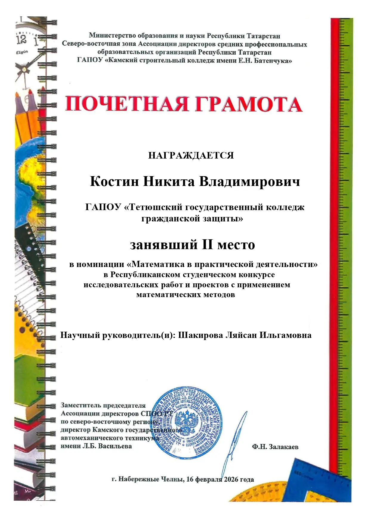 Высокая оценка труда: преподаватель Тетюшского колледжа гражданской защиты удостоен благодарности председателя Государственного Совета РТ