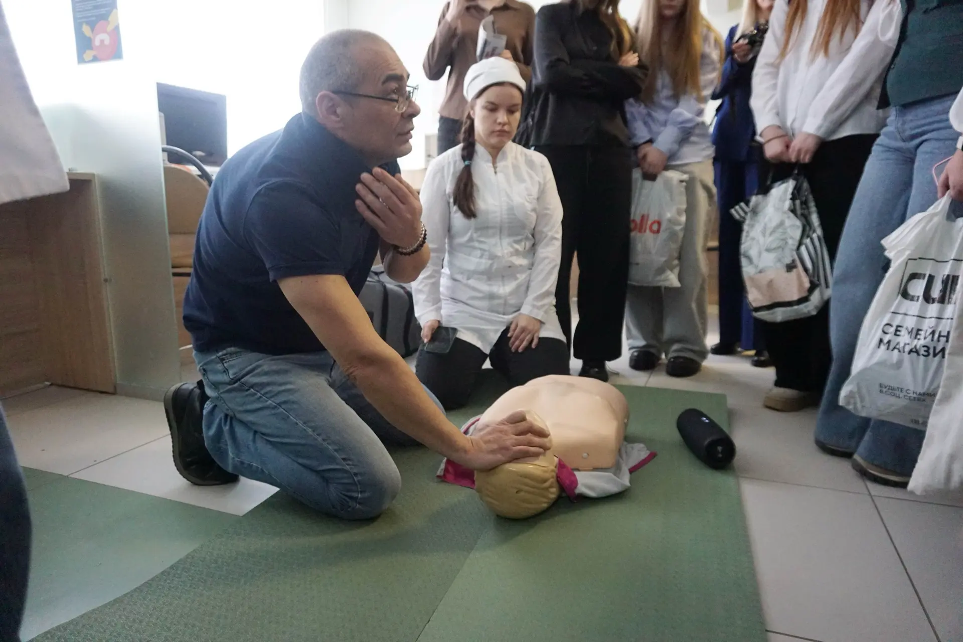 ◽️Программа началась с мастер-класса. В холле фельдшер скорой медицинской помощи Динар Джавадов на специальном манекене показал и рассказал, как правильно оказывать первую помощь. Под его чутким руководством первая группа ребят сразу же применила эти знания на практике.