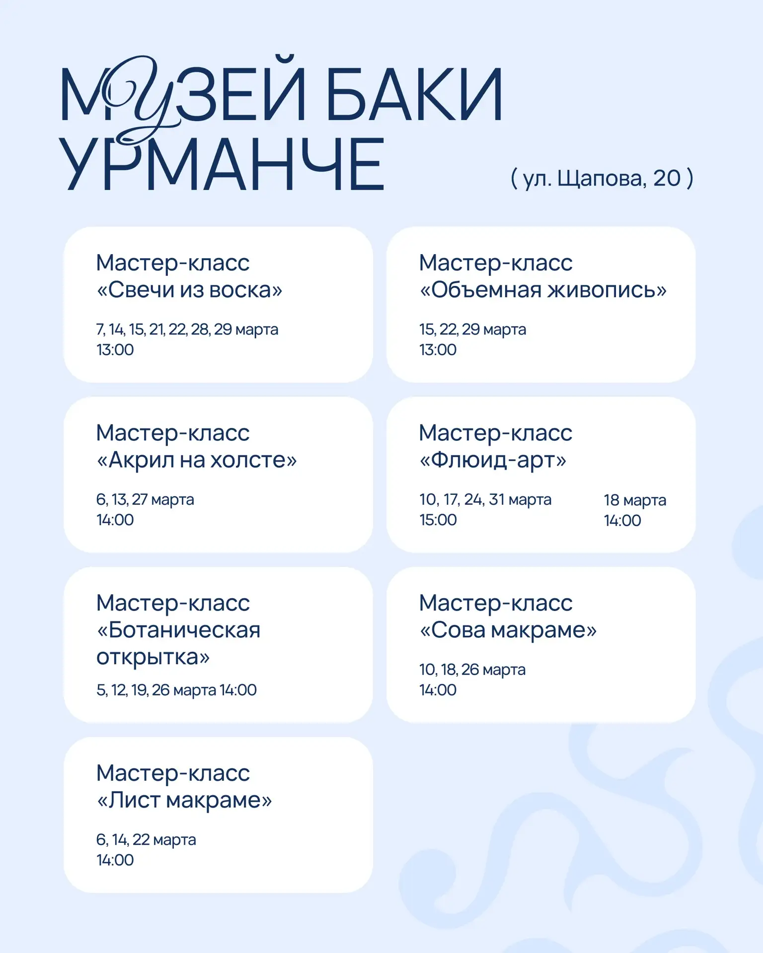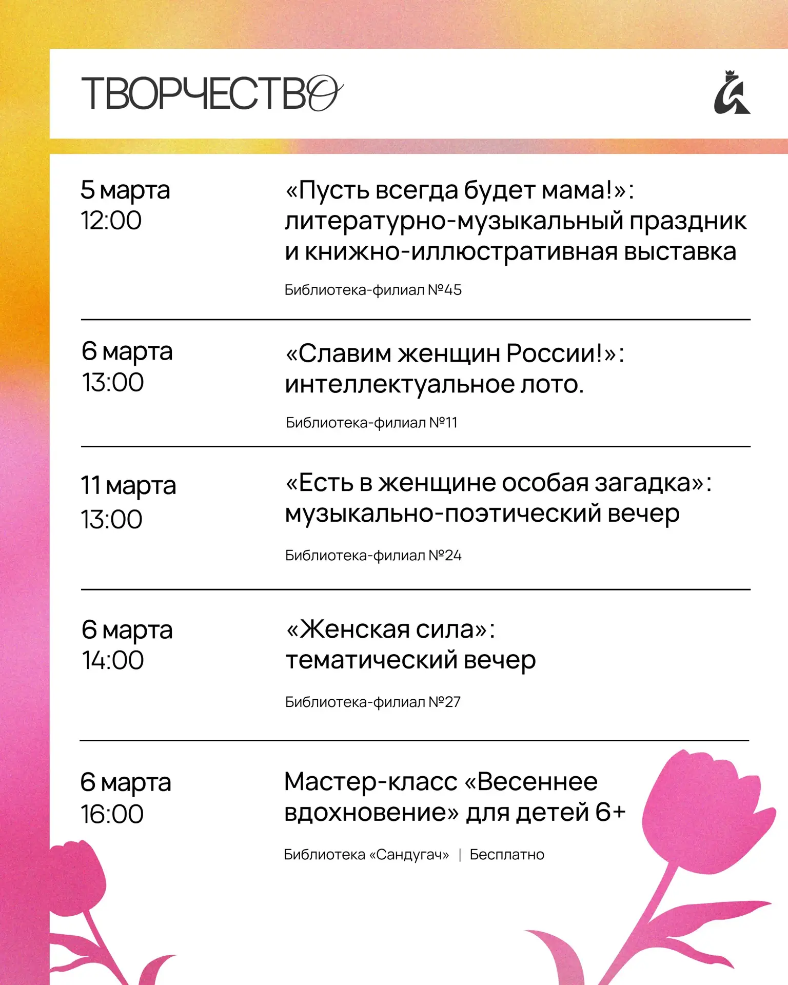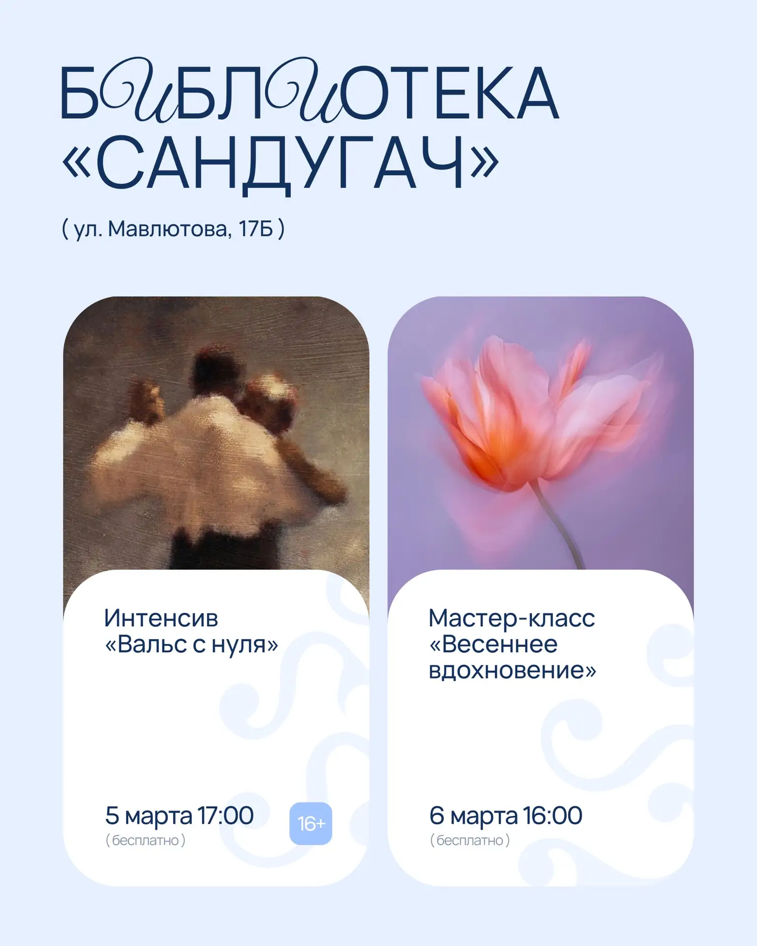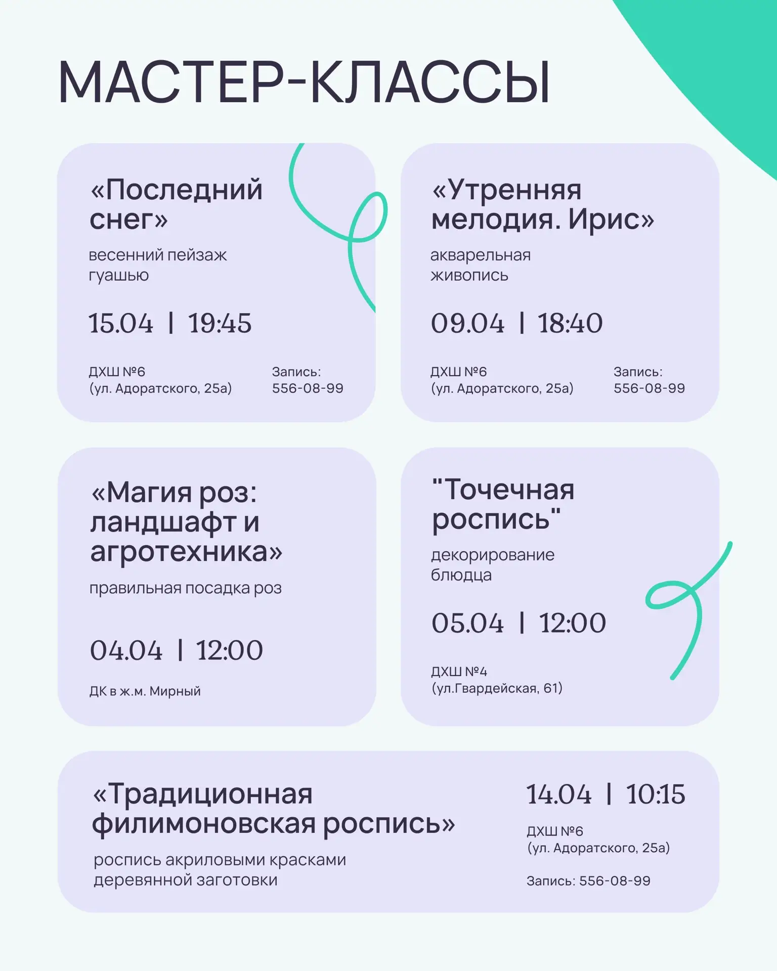 Продолжаем делиться весенними активностями, которые подойдут для любого возраста: творческие мастер-классы, музыкальные встречи, спектакли и многое другое. Прекрасная возможность раскрыть свои таланты, попробовать новое или просто душевно провести время!