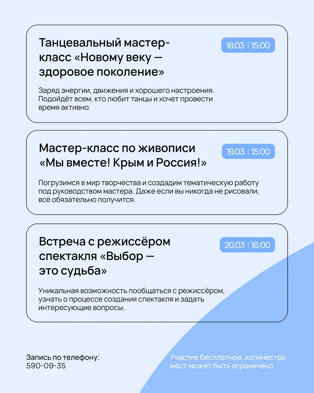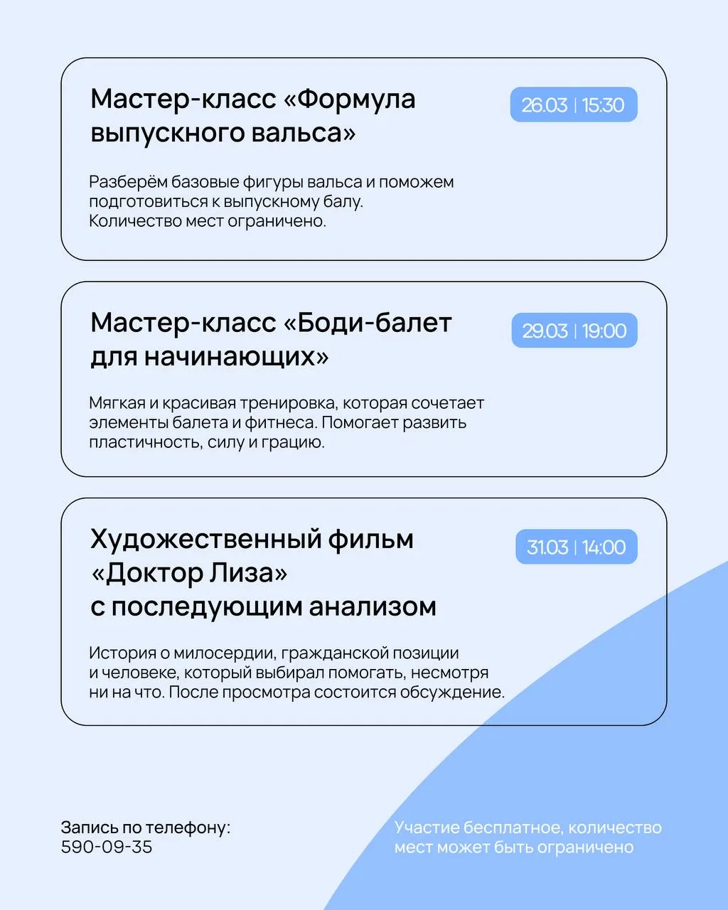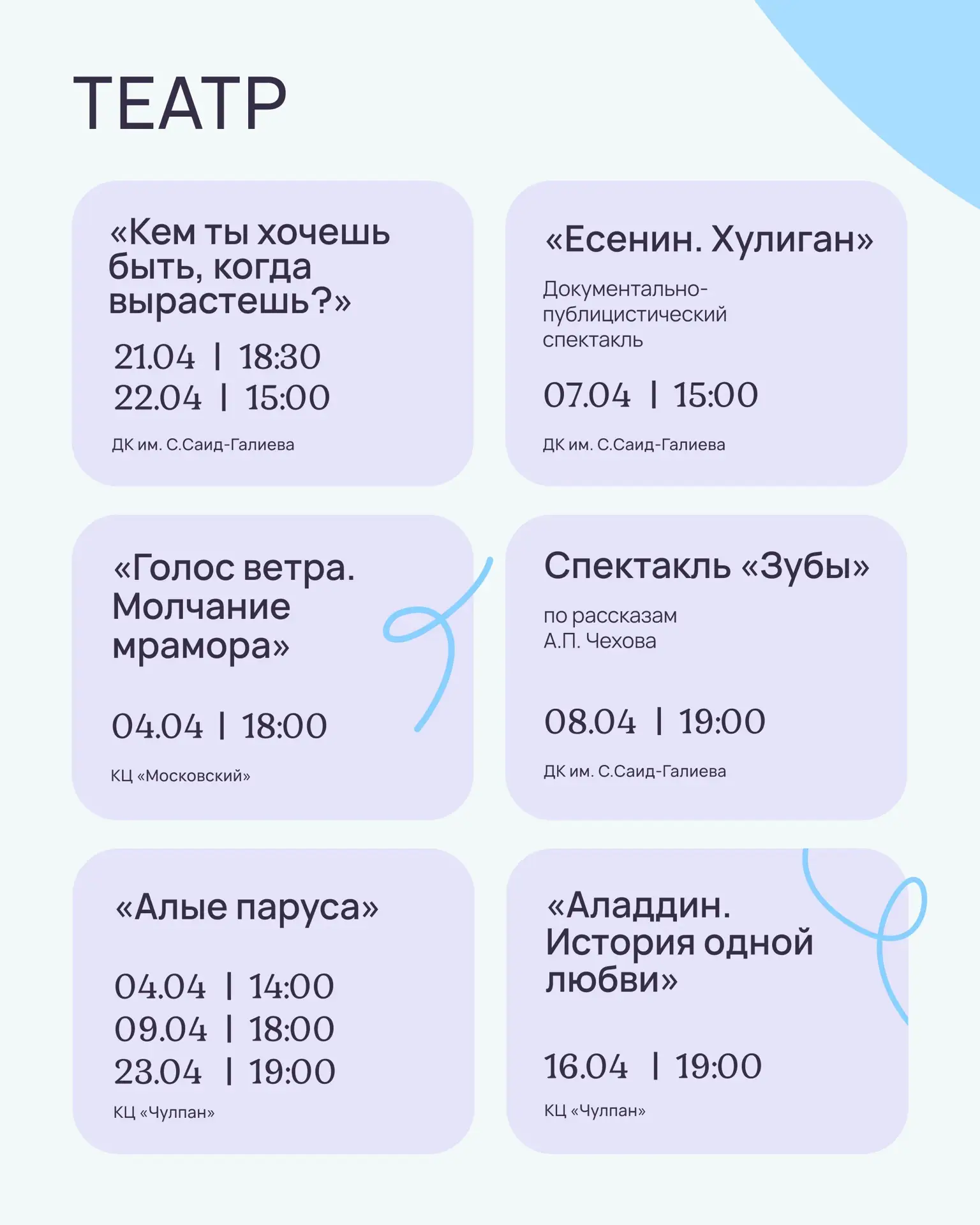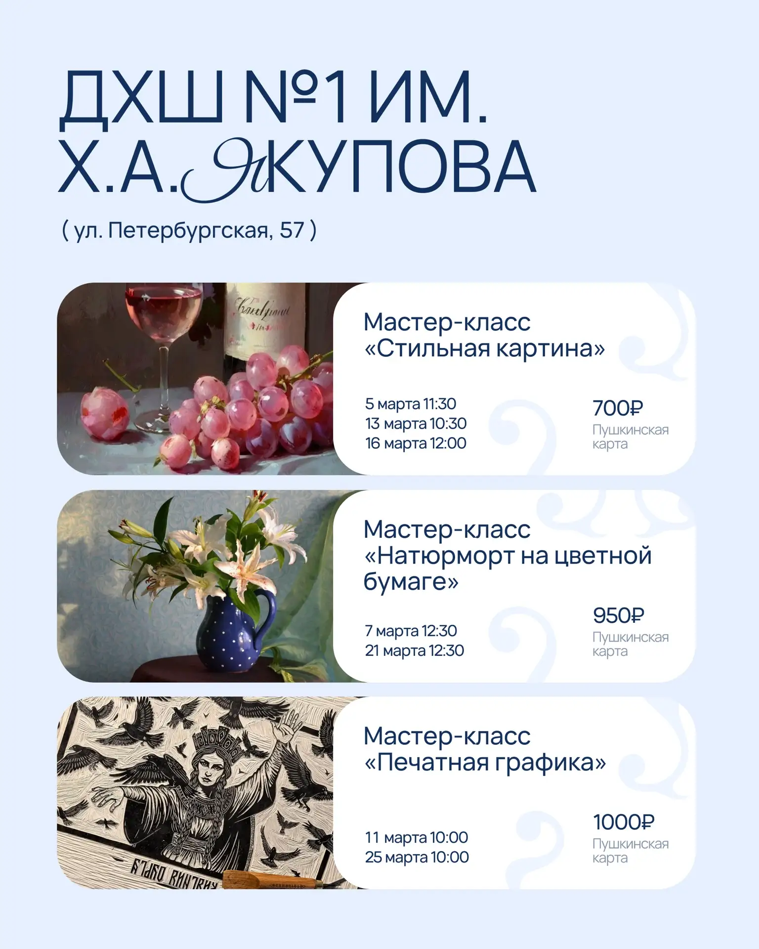 Продолжаем делиться весенними активностями, которые подойдут для любого возраста: творческие мастер-классы, музыкальные встречи, спектакли и многое другое. Прекрасная возможность раскрыть свои таланты, попробовать новое или просто душевно провести время!