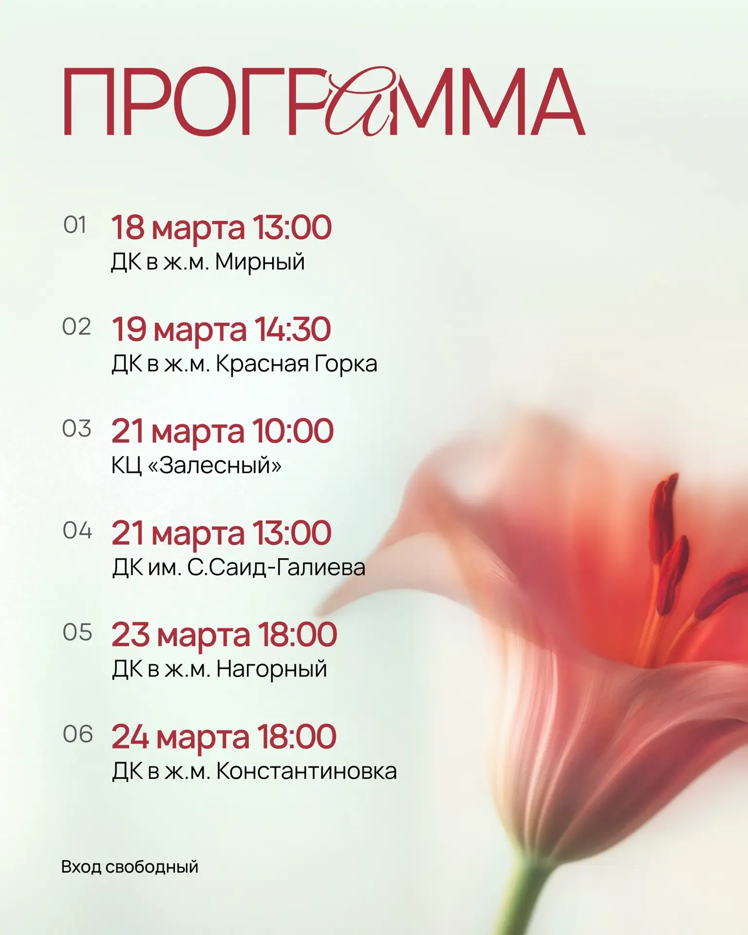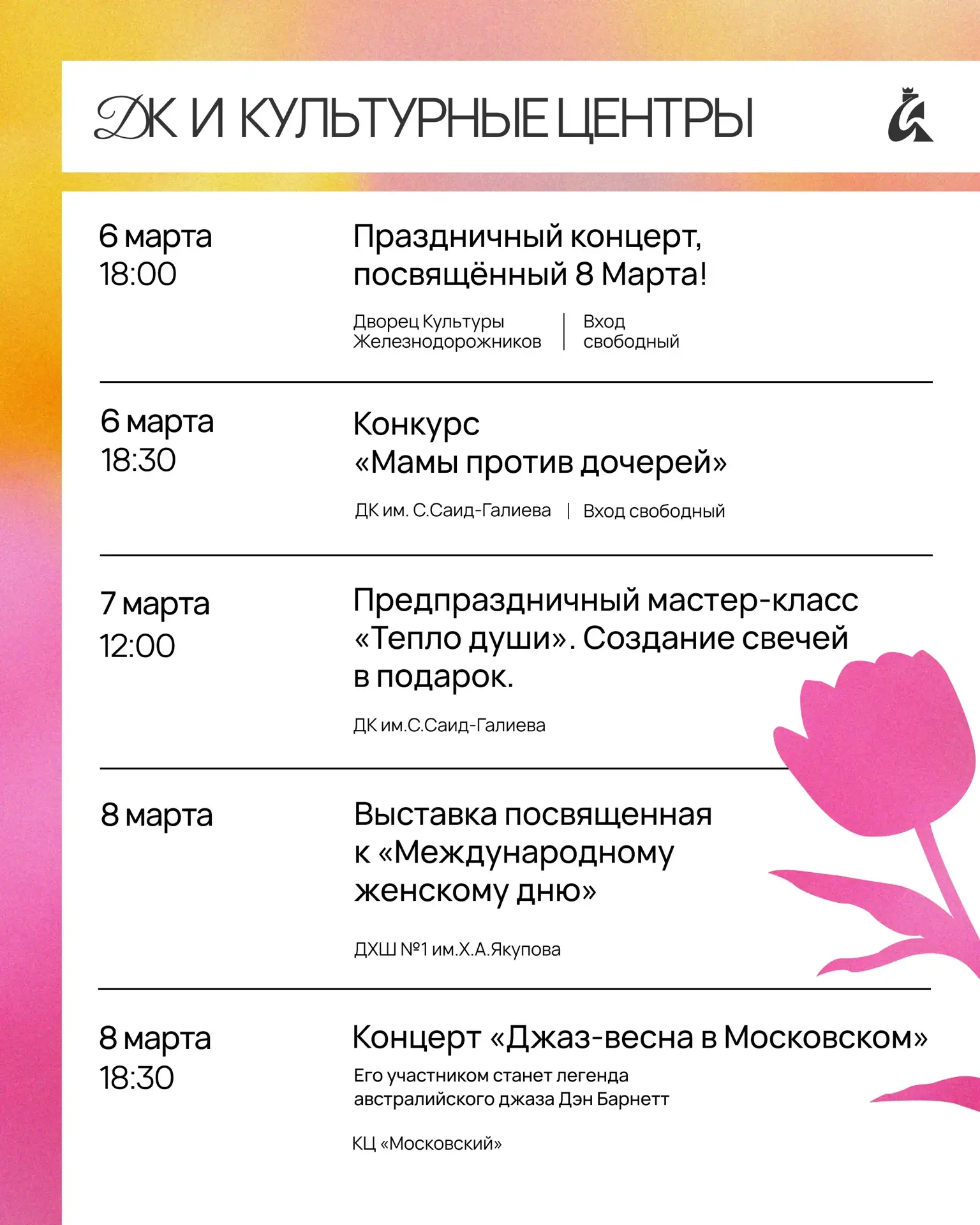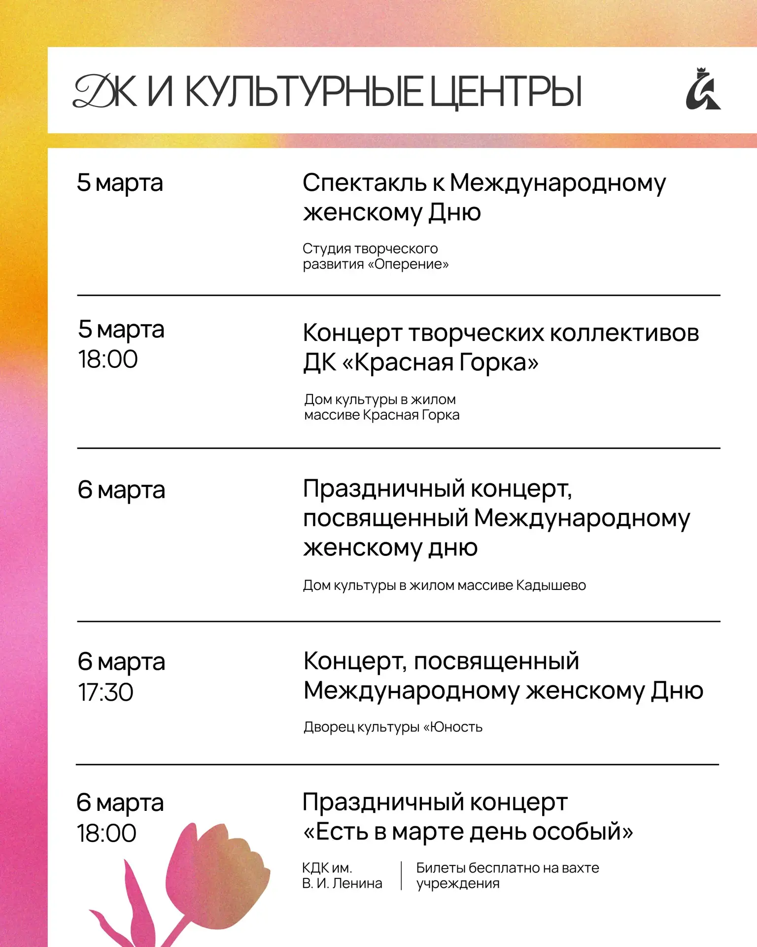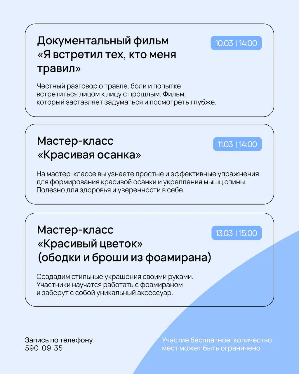 Продолжаем делиться весенними активностями, которые подойдут для любого возраста: творческие мастер-классы, музыкальные встречи, спектакли и многое другое. Прекрасная возможность раскрыть свои таланты, попробовать новое или просто душевно провести время!