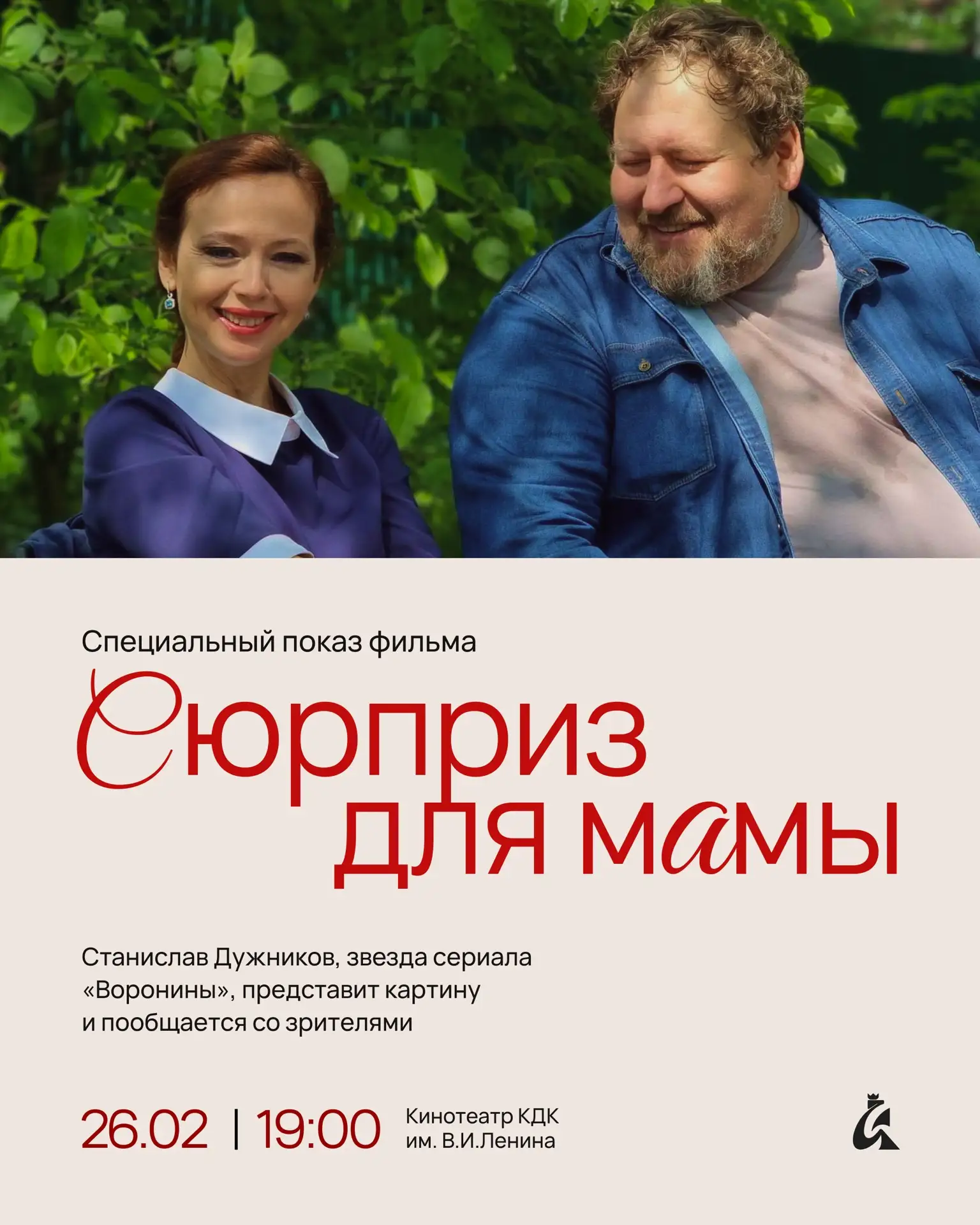 Совсем скоро в кинотеатре КДК им.В.И.Ленина состоится премьера кинофильма «Сюрприз для мамы» в главных ролях с Еленой Захаровой и Станиславом Дужниковым. Режиссер картины: Каринэ Фолиянц.