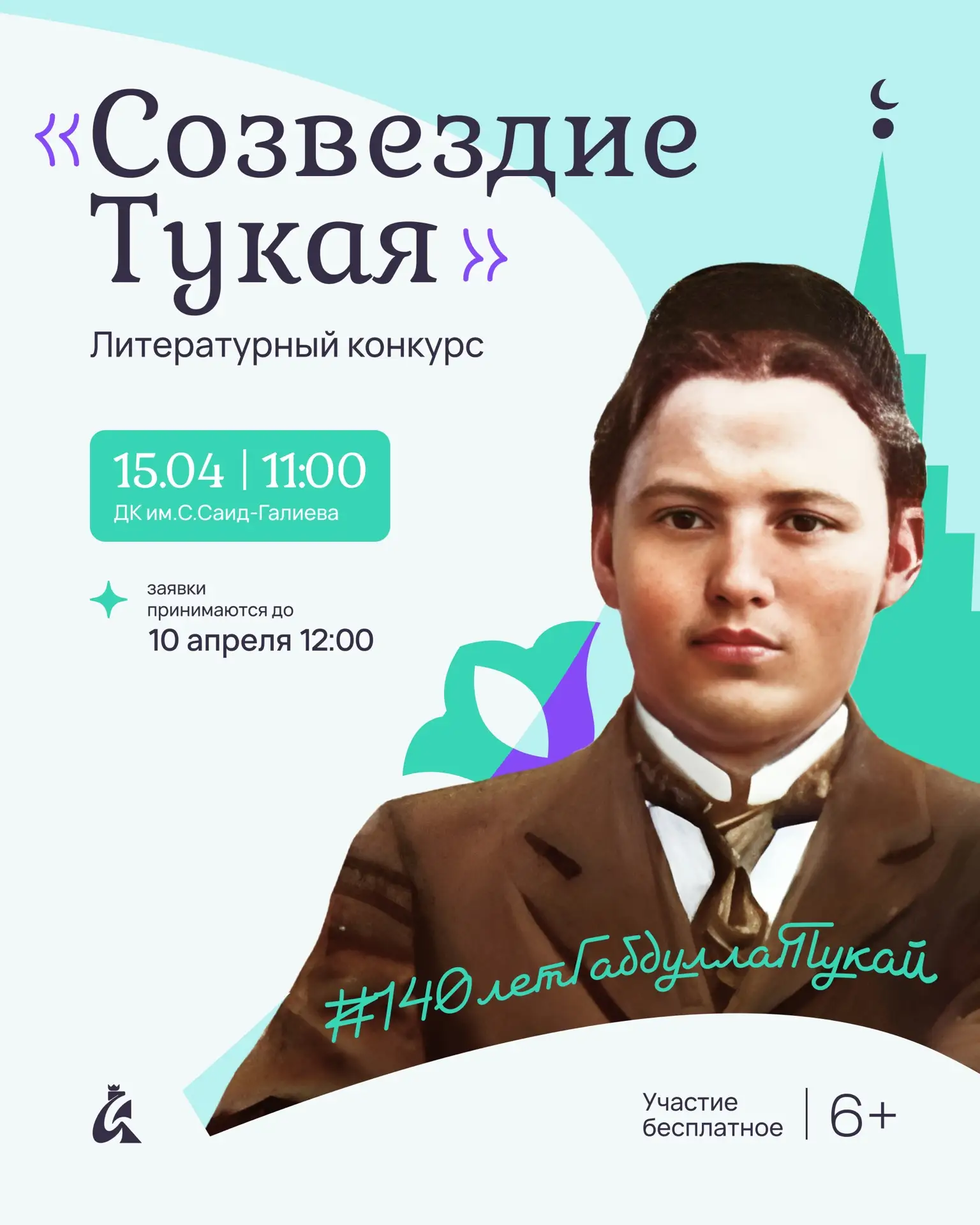 В этом году исполняется 140 лет со дня рождения великого татарского поэта Габдуллы Тукая. Дворец Культуры имени С.Саид-Галиева проводит литературный конкурс «Созвездие Тукая», итоги которого пройдут 15 апреля в 11:00. Конкурс включает 7 номинаций и 3 возрастные категории, а к участию приглашаются ученики с 1 по 11 класс.