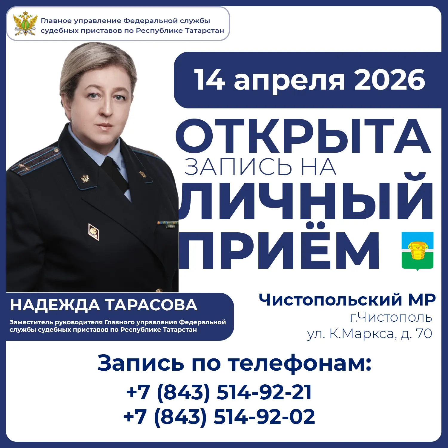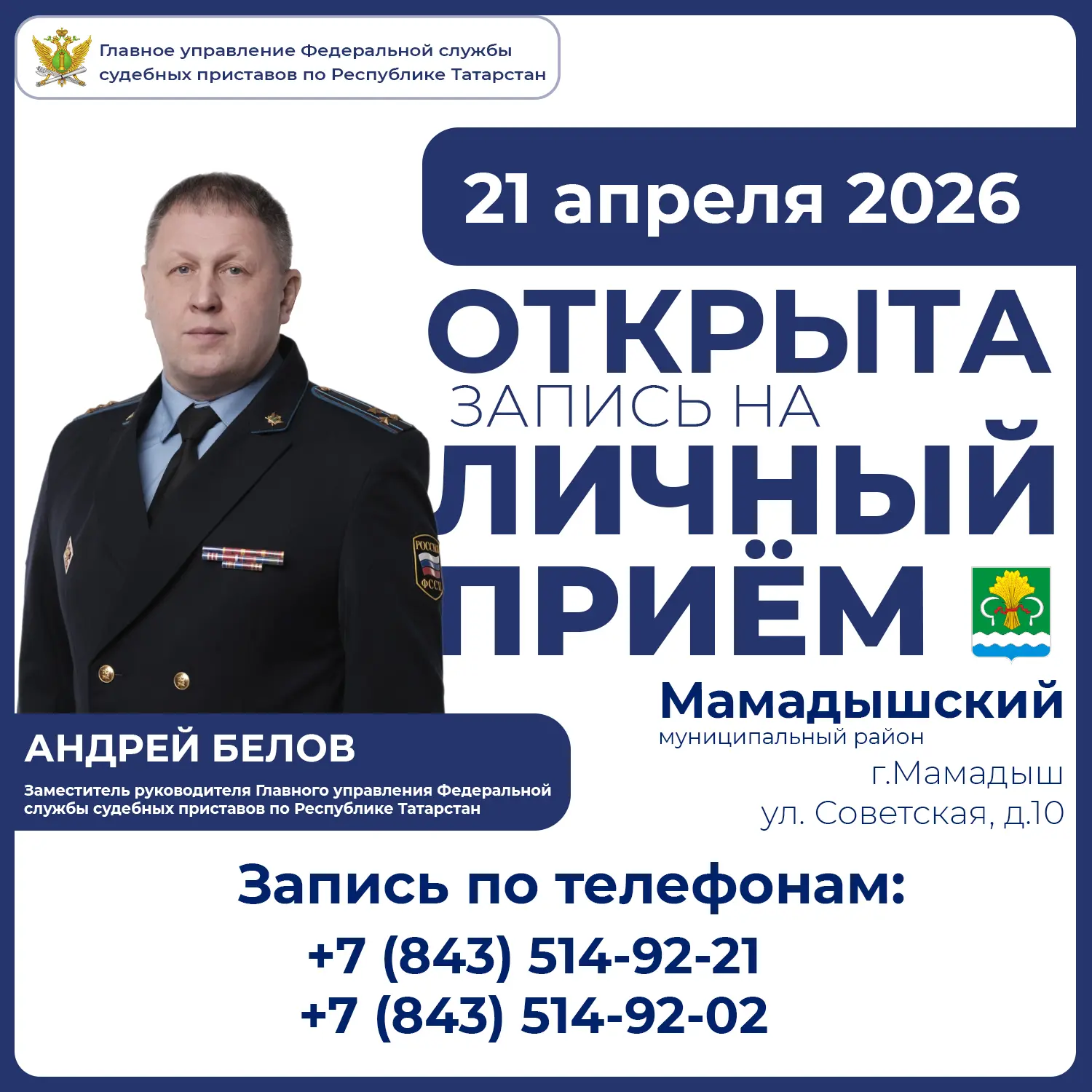 📣 Главное управление Федеральной службы судебных приставов по Республике Татарстан информирует о проведении личного приема граждан заместителем руководителя ГУФССП России по Республике Татарстан – заместителем главного судебного пристава Республики Татарстан Андреем Владимировичем Беловым.