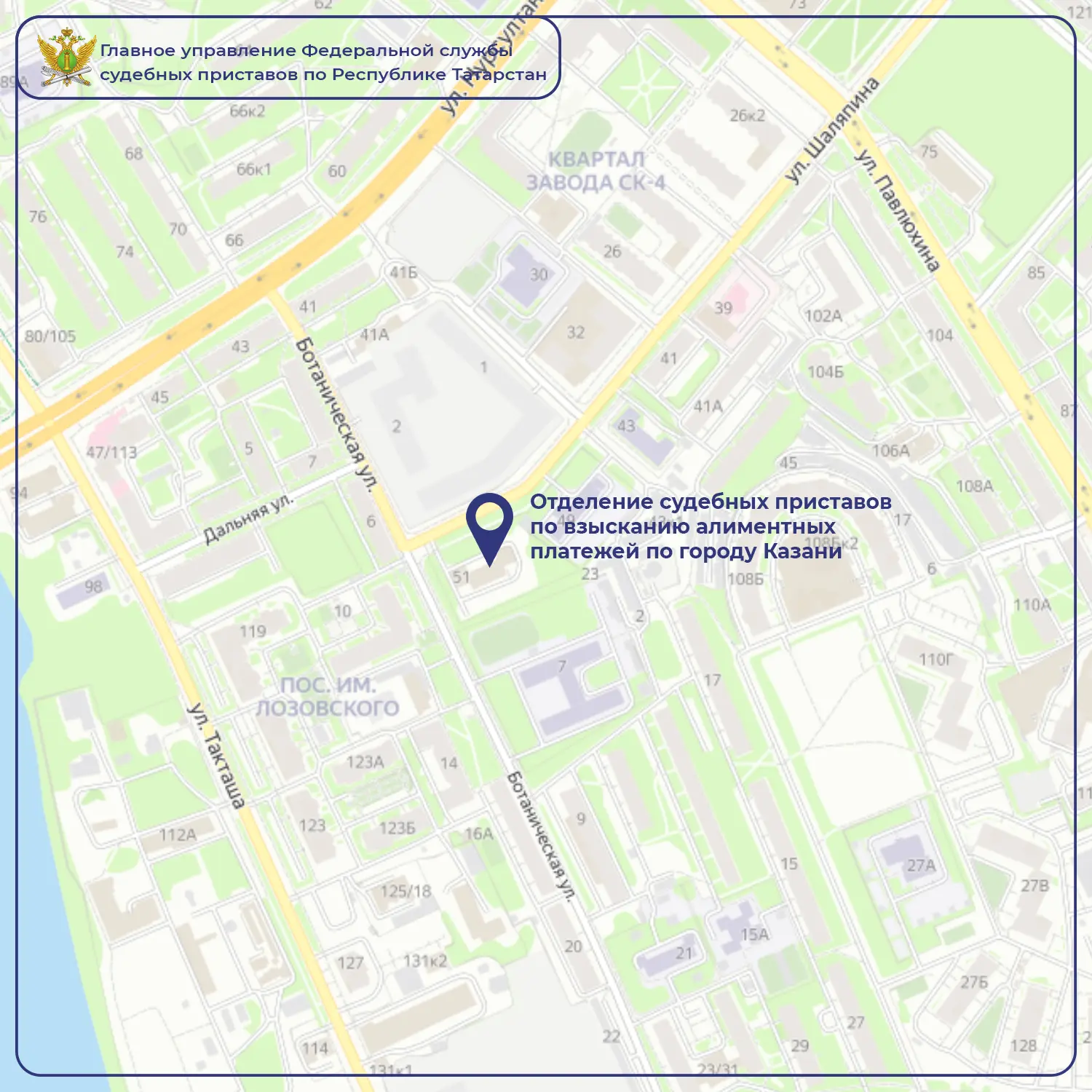 Отделение расположено по адресу: г.Казань, ул. Шаляпина, 51. Прием граждан ведется по предварительной записи - это помогает сократить время ожидания и сделать взаимодействие более точечным: судебный пристав заранее подготовит информацию по конкретному делу.