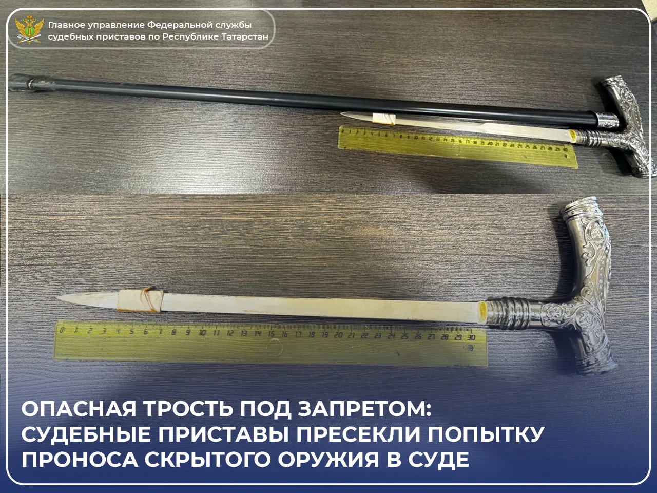 Напомню простую вещь: в здания судов нельзя приносить оружие, боеприпасы и любые опасные предметы - даже если они замаскированы под что-то безобидное. Суд - не место для скрытых клинков и неожиданных эффектов.