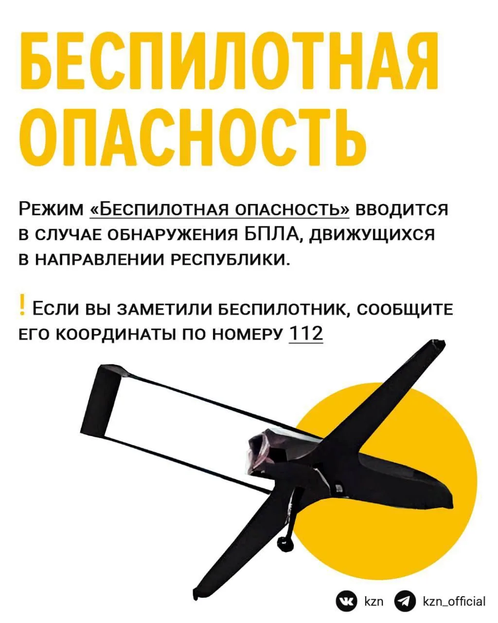 🔸 «Беспилотная опасность» вводится при обнаружении БПЛА, движущихся в направлении республики. Если вы заметили подозрительный объект в небе — сообщите по номеру 112. Не размещайте фото и видео полётов БПЛА в интернете.